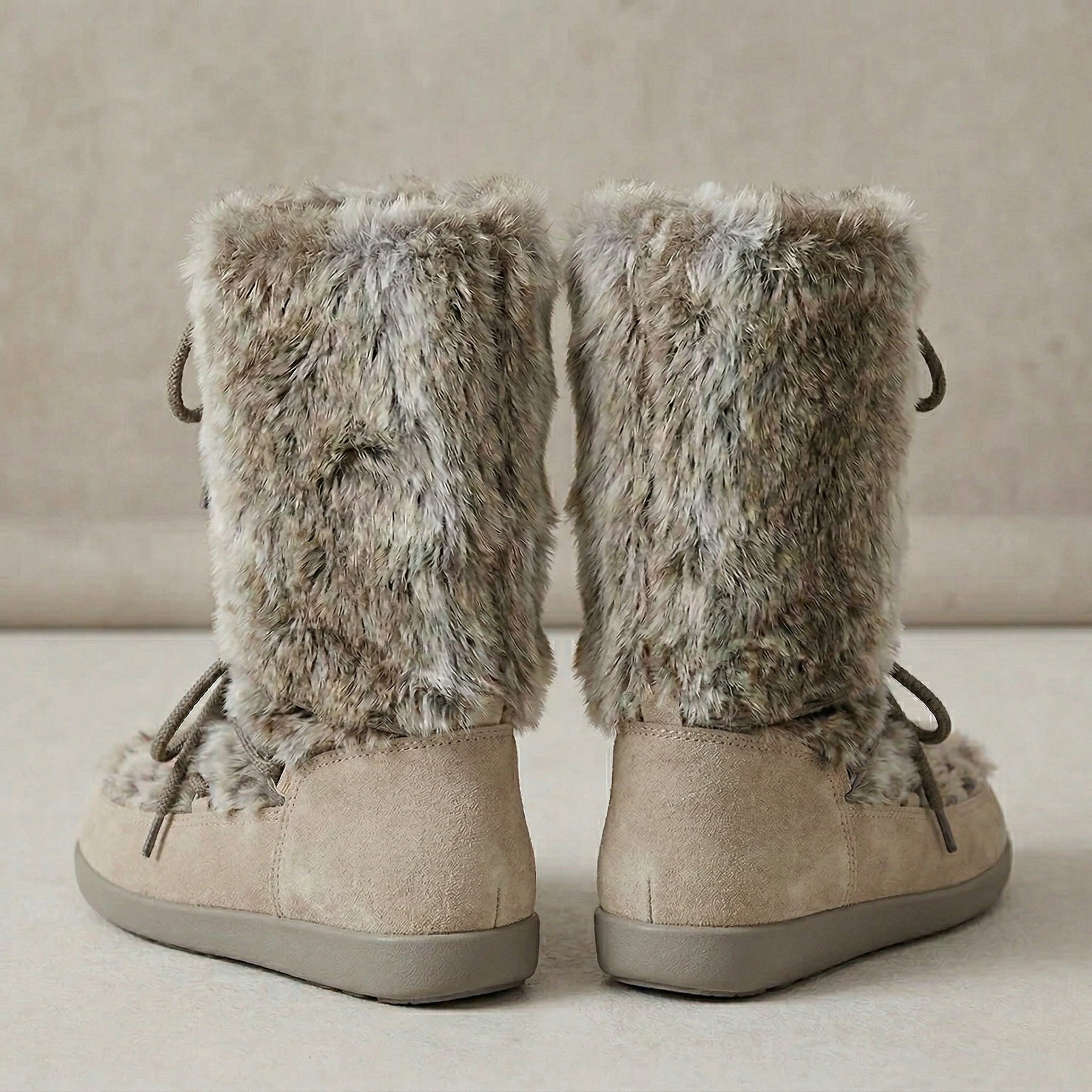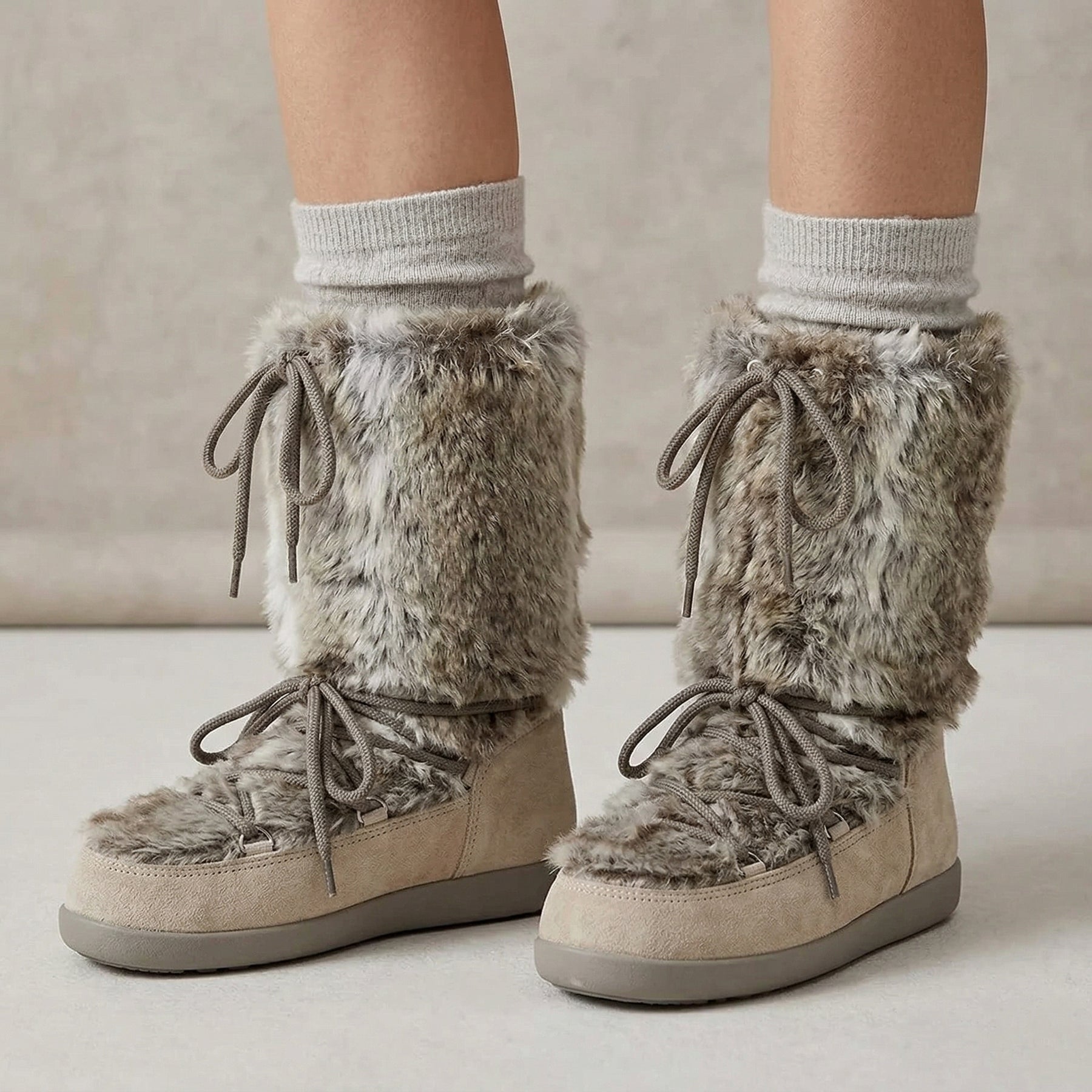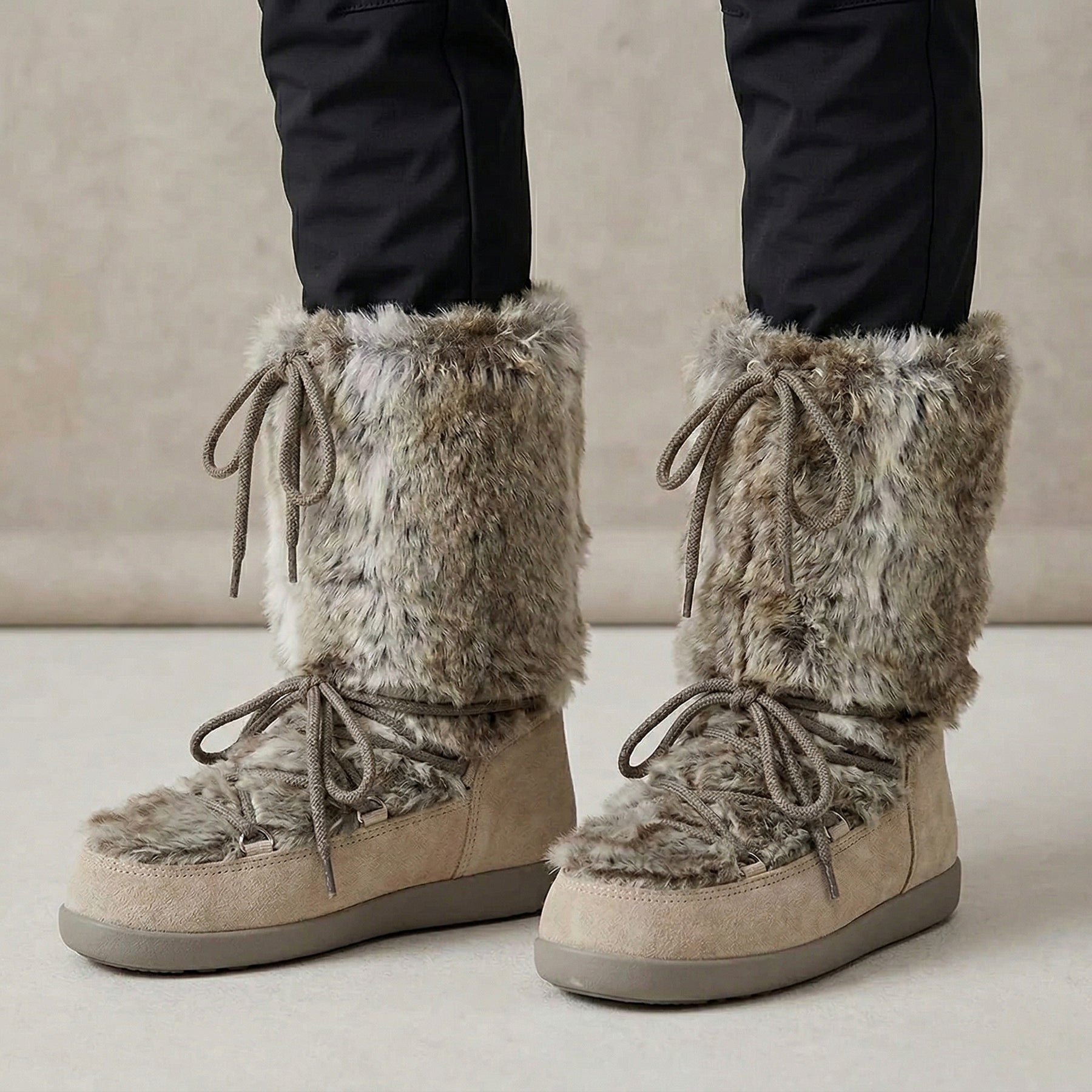 Women's platform snow boots, Winter 2026 design. Soft and cozy flannel shaft with lace-up closure for a secure fit. Non-slip rubber outsole provides traction on icy and snowy surfaces. Polyurethane insole offers comfort and thermal insulation. Reinforced and padded construction ensures maximum warmth during the coldest months. Perfect for keeping your feet warm, dry, and protected in any winter conditions.