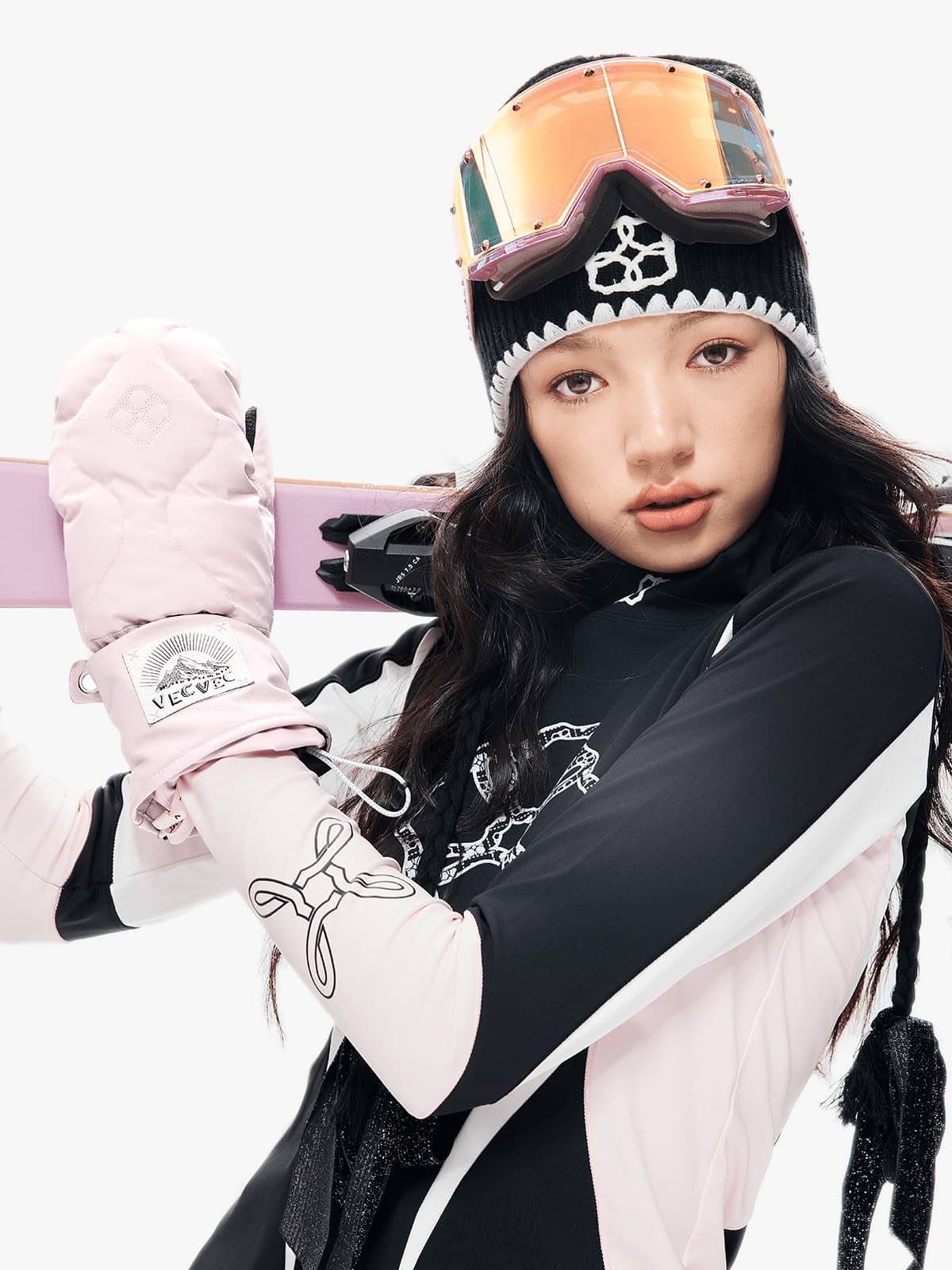 2. Playful braided accents paired with satin-ribbon bows (anti-snag finish) add sporty elegance to slopeside styling.