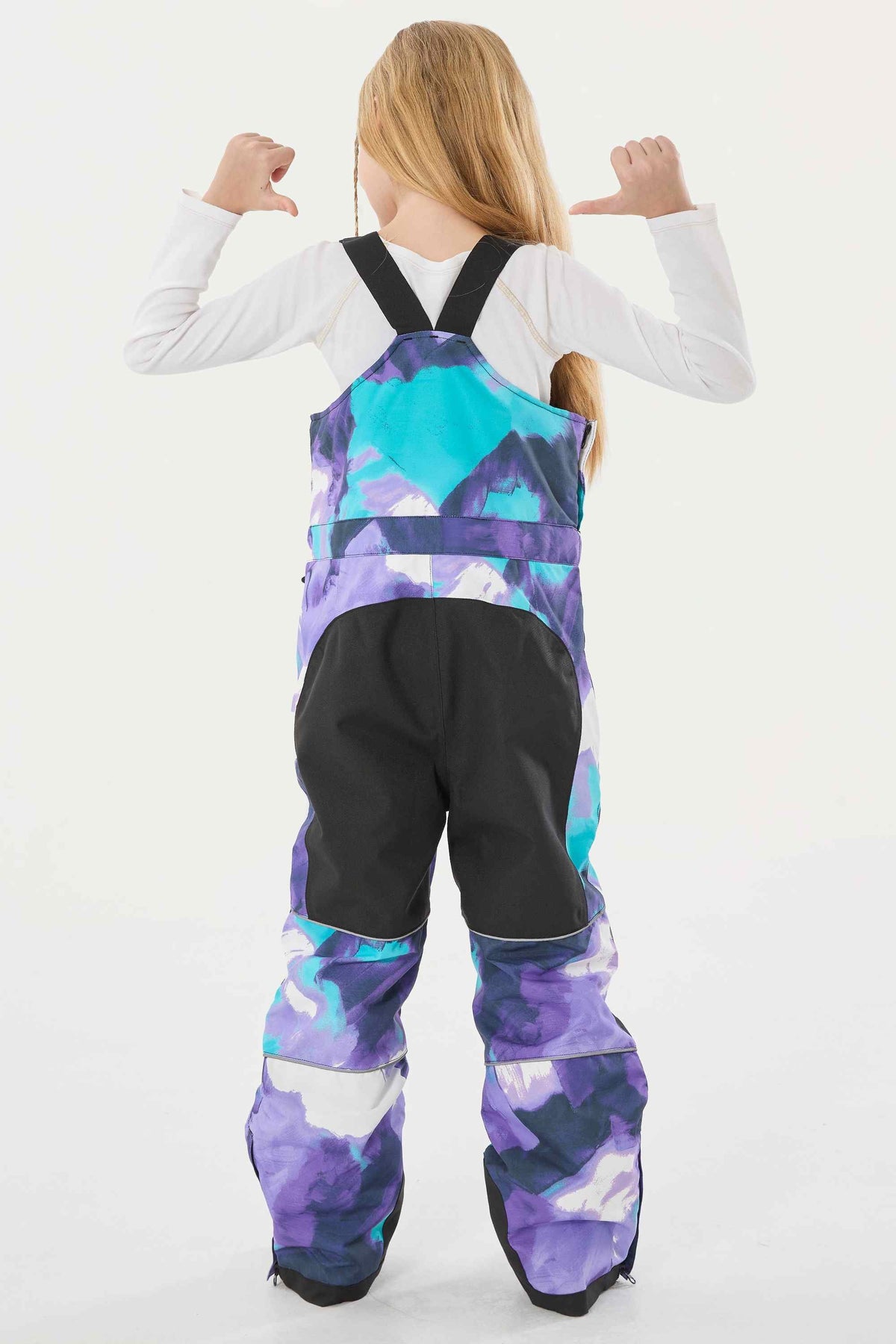 Kids’ snow bibs with adjustable straps and hook-and-loop side tabs for a comfy fit. Reinforced seat and knees, reflective strips, anti-slip gaiters, and side calf zipper hems keep kids safe and ready for snowy fun.