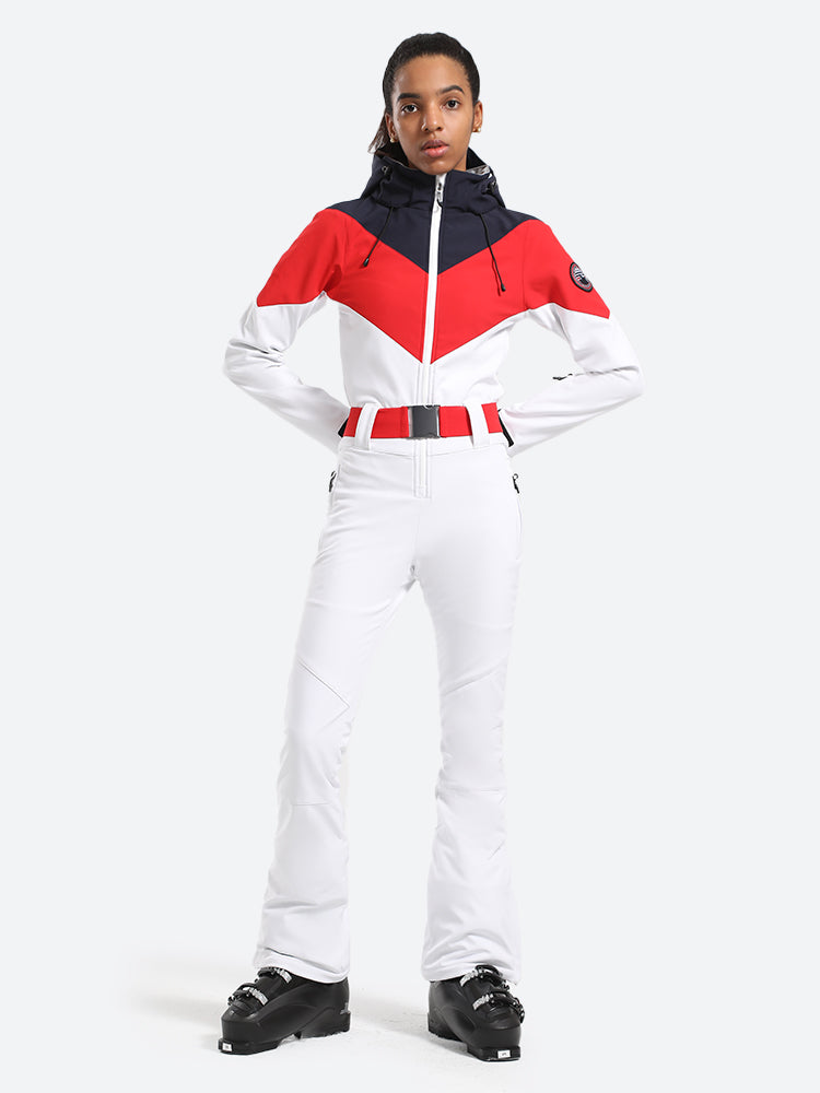 Traje d'esquí impermeable d'una peça amb cinturó i tot en un blau marí i vermell per a dona