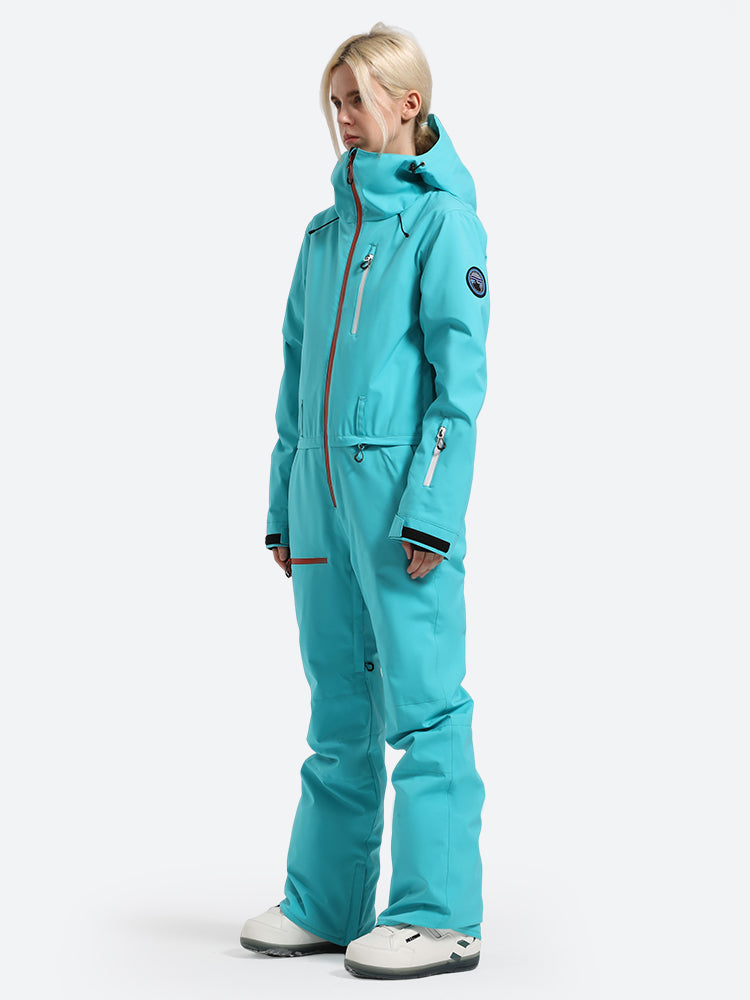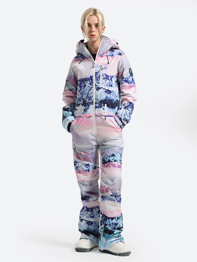 This GSou Snow one-piece ski suit is specifically designed for skiing, crafted with high-quality waterproof and breathable fabrics to withstand cold, snow, and moisture. The bright colors and unique cut create a vibrant look, adding a cool, bold personality.