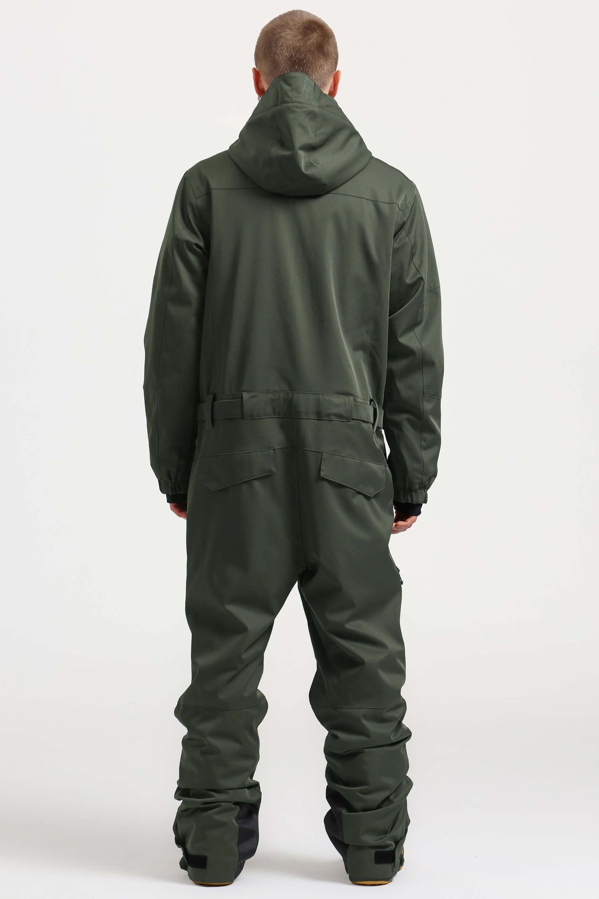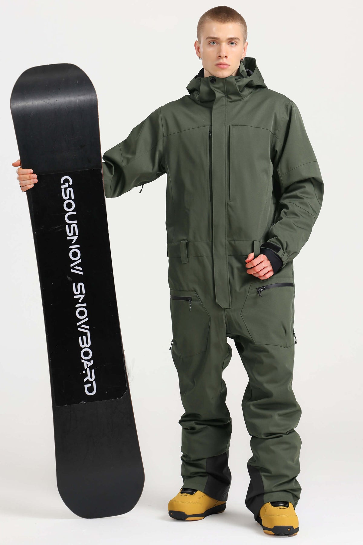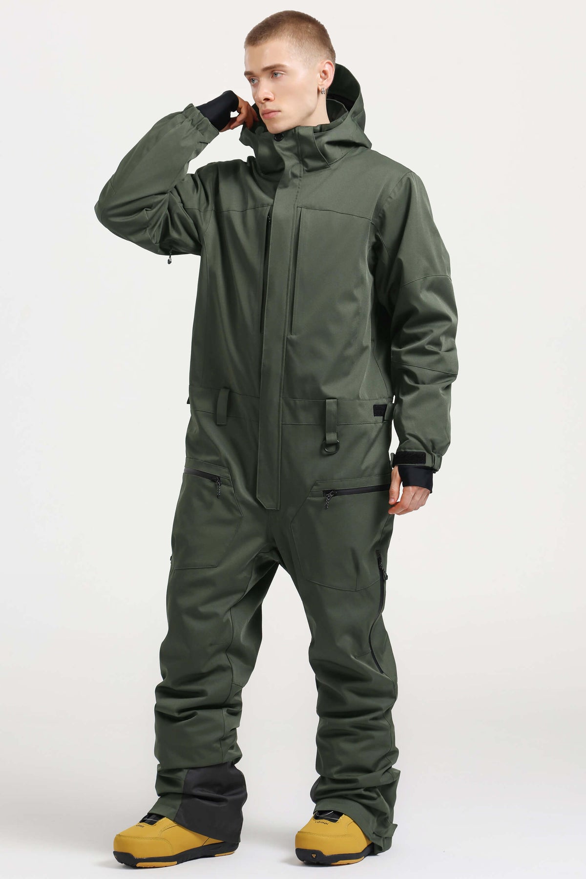 Men's Army Green Stylish Waterproof & Windproof Loose-Fit One-Piece Ski Suit with Detachable Hood & Multipockets