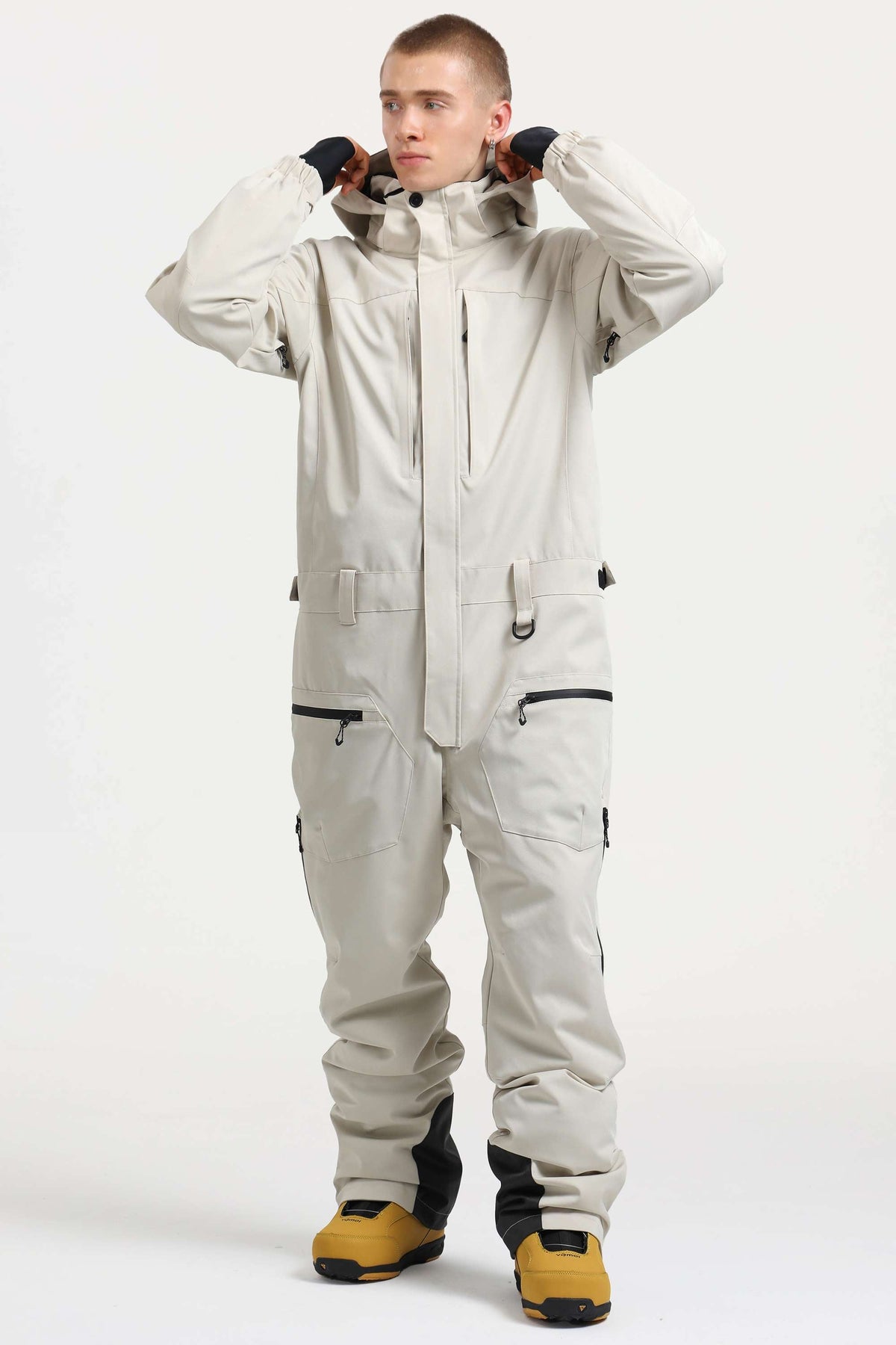 Stay warm and stylish on the slopes with this oversize One-Piece Ski Suit. Featuring a detachable hood, adjustable waist tabs, and breathable waterproof vents, it offers all-weather protection. Multiple pockets—including hidden chest, sleeve, and goggle compartments—keep your essentials secure, while reinforced leg openings and adjustable cuffs ensure durability and a perfect fit.