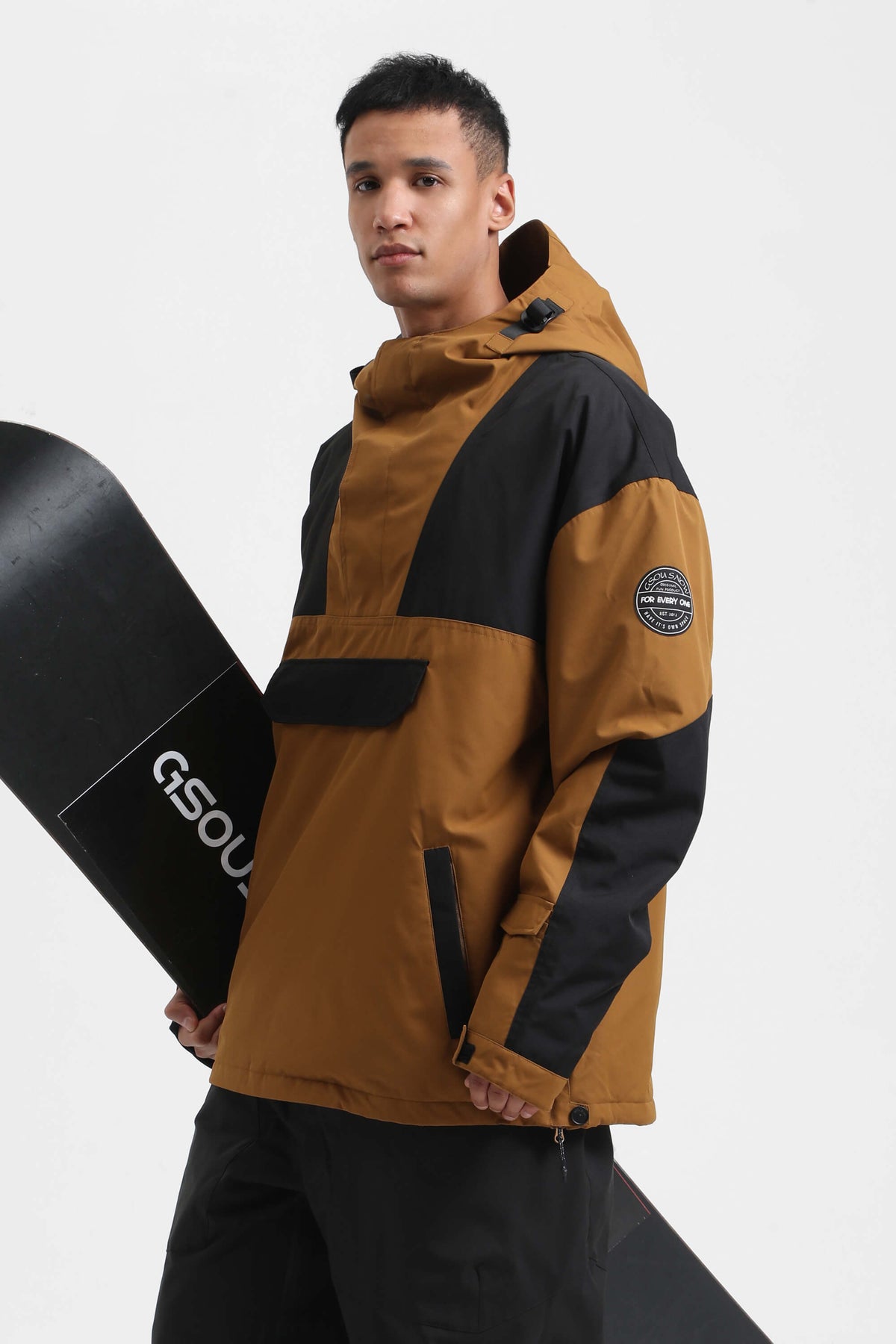 The GSou Snow ski Anoraks feature a color-block design and are both waterproof and warm. They also come with an adjustable hood, adjustable cuffs, and a powder skirt. Right-side underarm zipper vent allows for easy access to the bib, while the hem includes a drawstring and snap buttons.