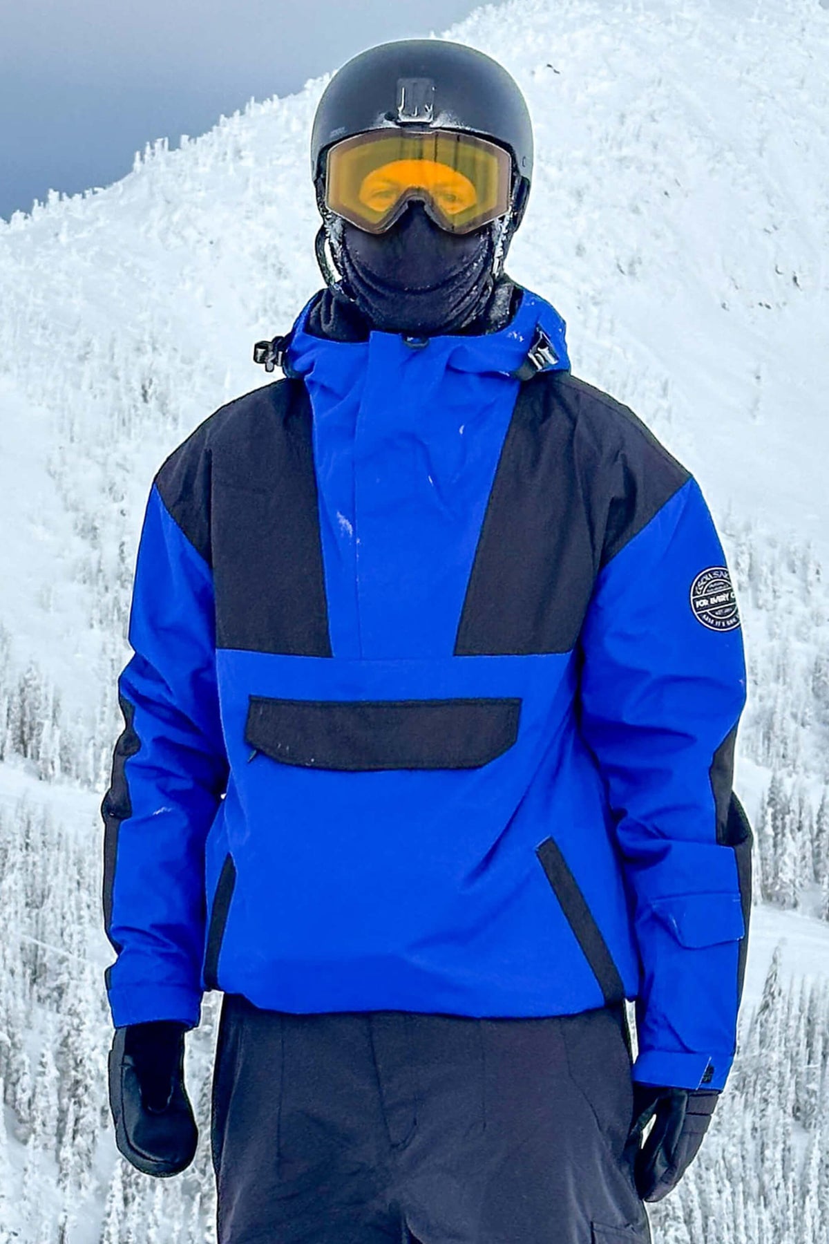 The GSou Snow ski Anoraks feature a color-block design and are both waterproof and warm. They also come with an adjustable hood, adjustable cuffs, and a powder skirt. Right-side underarm zipper vent allows for easy access to the bib, while the hem includes a drawstring and snap buttons.