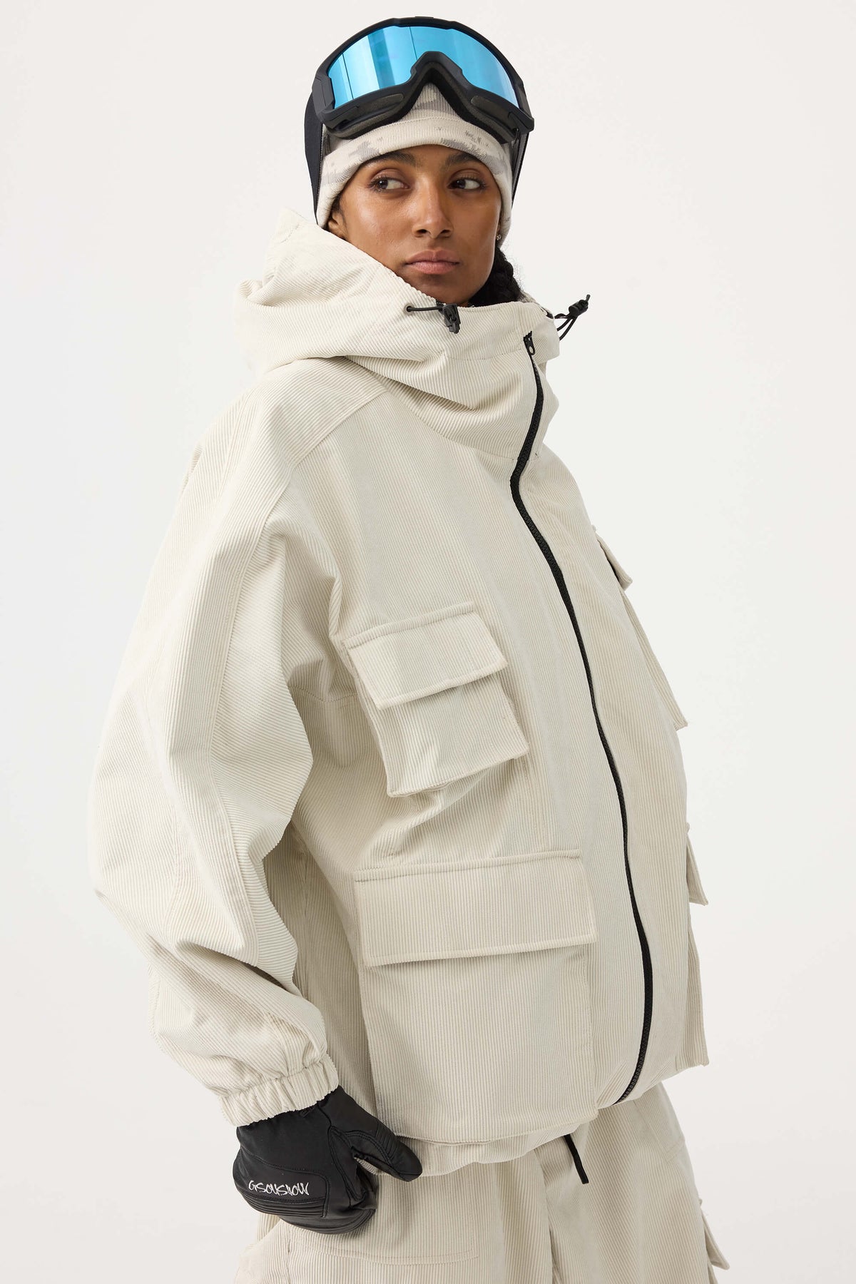 Women's Khaki Waterproof Corduroy Batwing Sleeve Large Pocket Snow Jacket