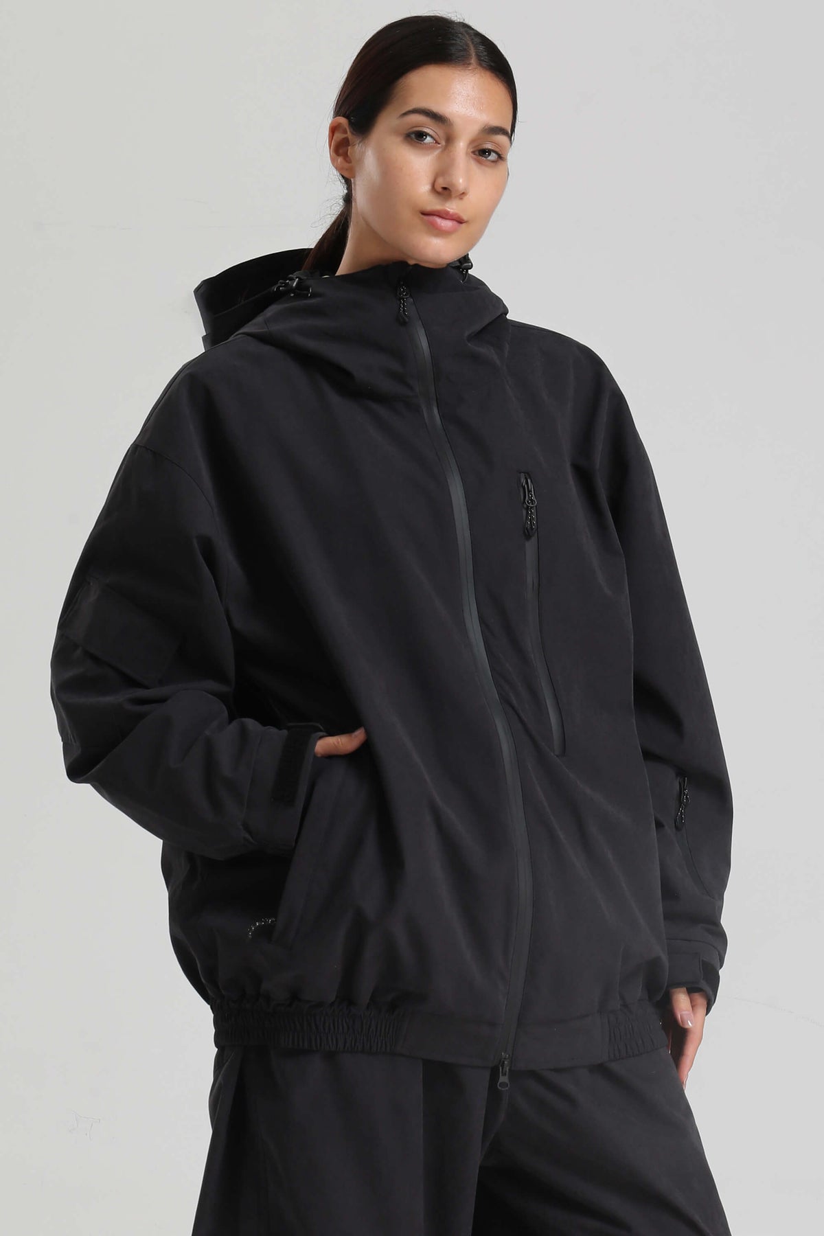 Designed for snowy pursuits, this minimalist jacket features a 20K waterproof, 15K breathable shell with DWR finish and taped zippers. Details like a fleece-lined collar, underarm vents, and adjustable hood offer comfort in motion. Multiple hidden and sleeve pockets keep gear secure, while a stretch powder skirt and thumbhole cuffs seal out snow.