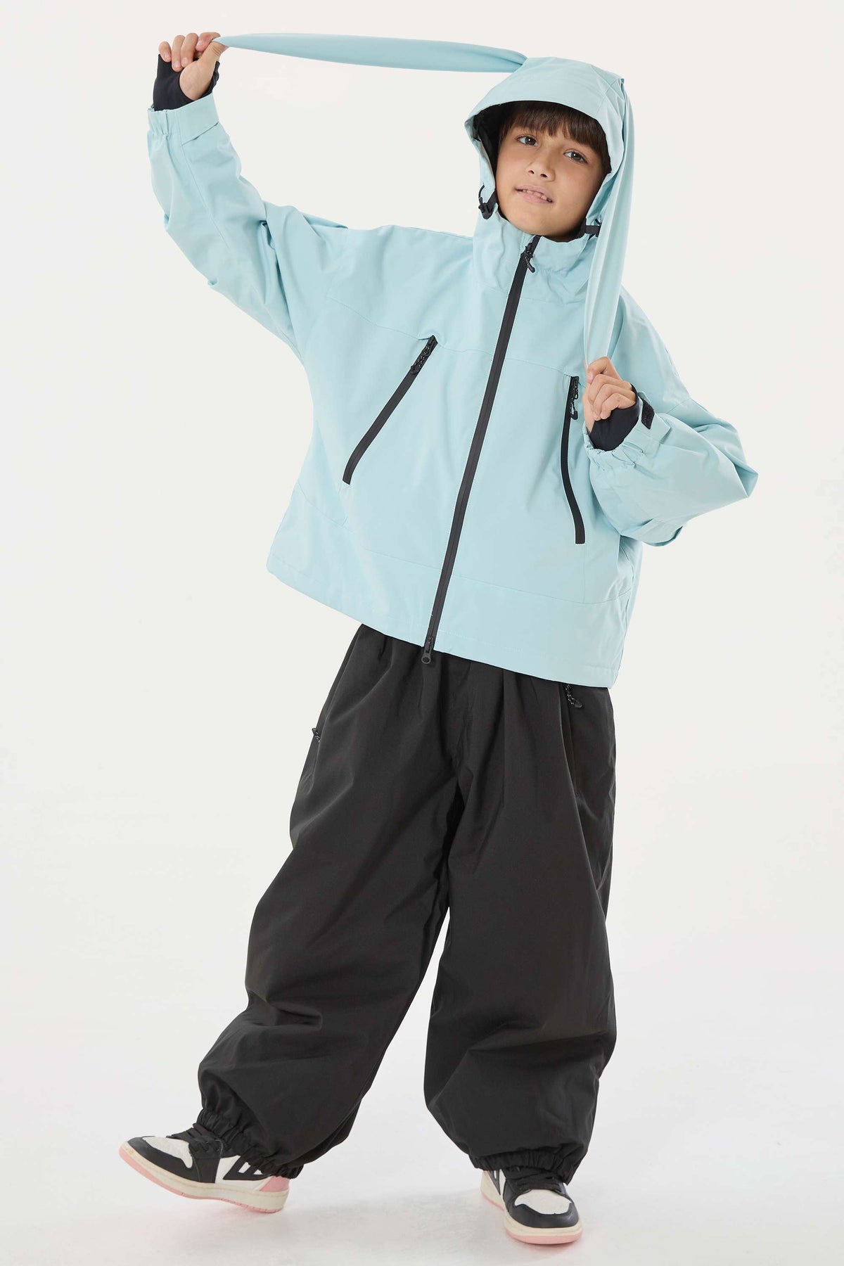 This kids' snow jacket delivers a sporty, relaxed look. A detachable ear-hood adds playful versatility, while the drop-shoulder design enhances comfort and mobility. With secure pockets, thumbhole cuffs, and a grippy snow skirt, it keeps kids dry, warm, and free to move from the ski slopes to snowy play.