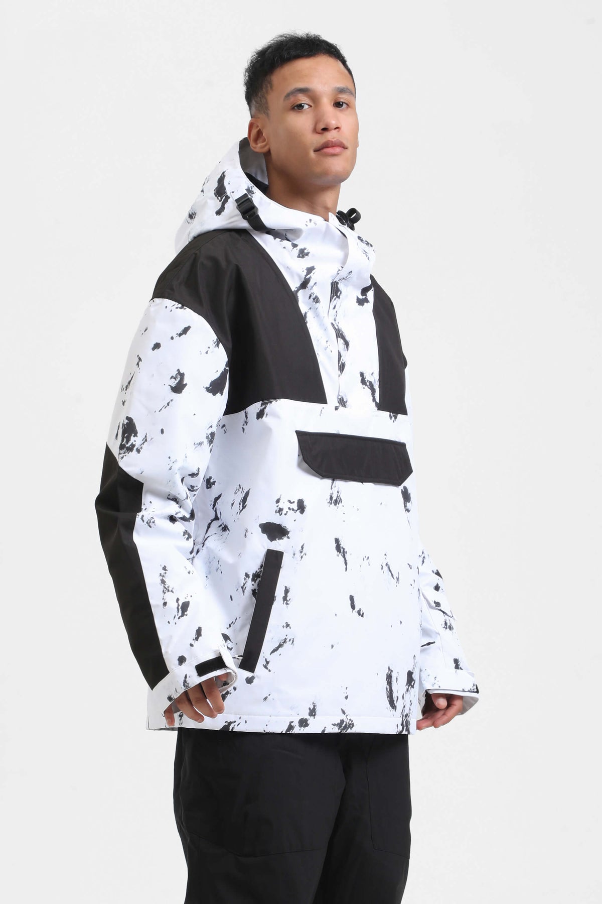 The GSou Snow ski Anoraks feature a color-block design and are both waterproof and warm. They also come with an adjustable hood, adjustable cuffs, and a powder skirt. Right-side underarm zipper vent allows for easy access to the bib, while the hem includes a drawstring and snap buttons.