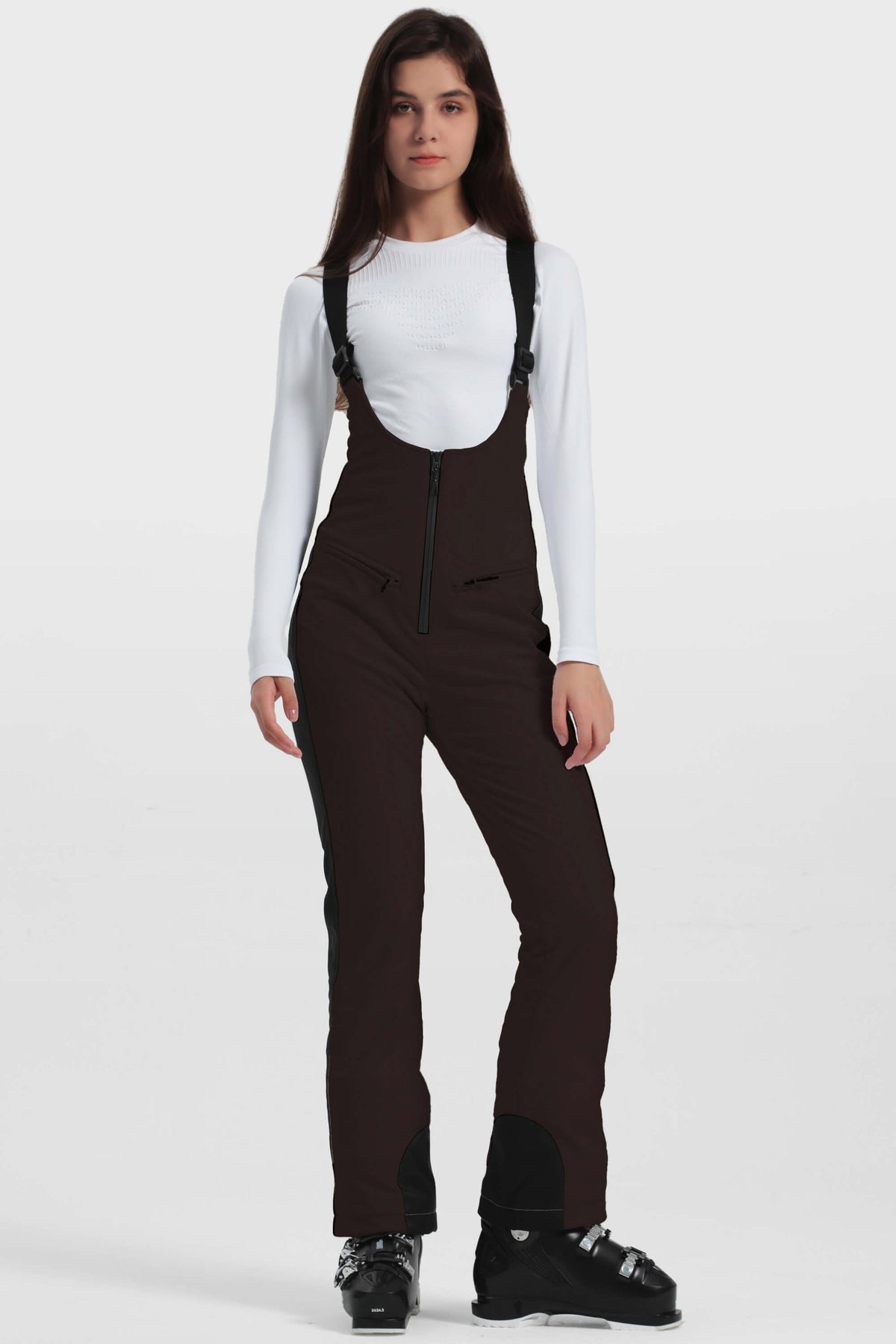 The slim ski bibs are made of 100% polyester fabric, providing warmth and waterproof protection. The bib features two pockets, and the center zipper is designed with a fully sealed waterproof zipper. The hem is equipped with an abrasion-resistant protection device.
