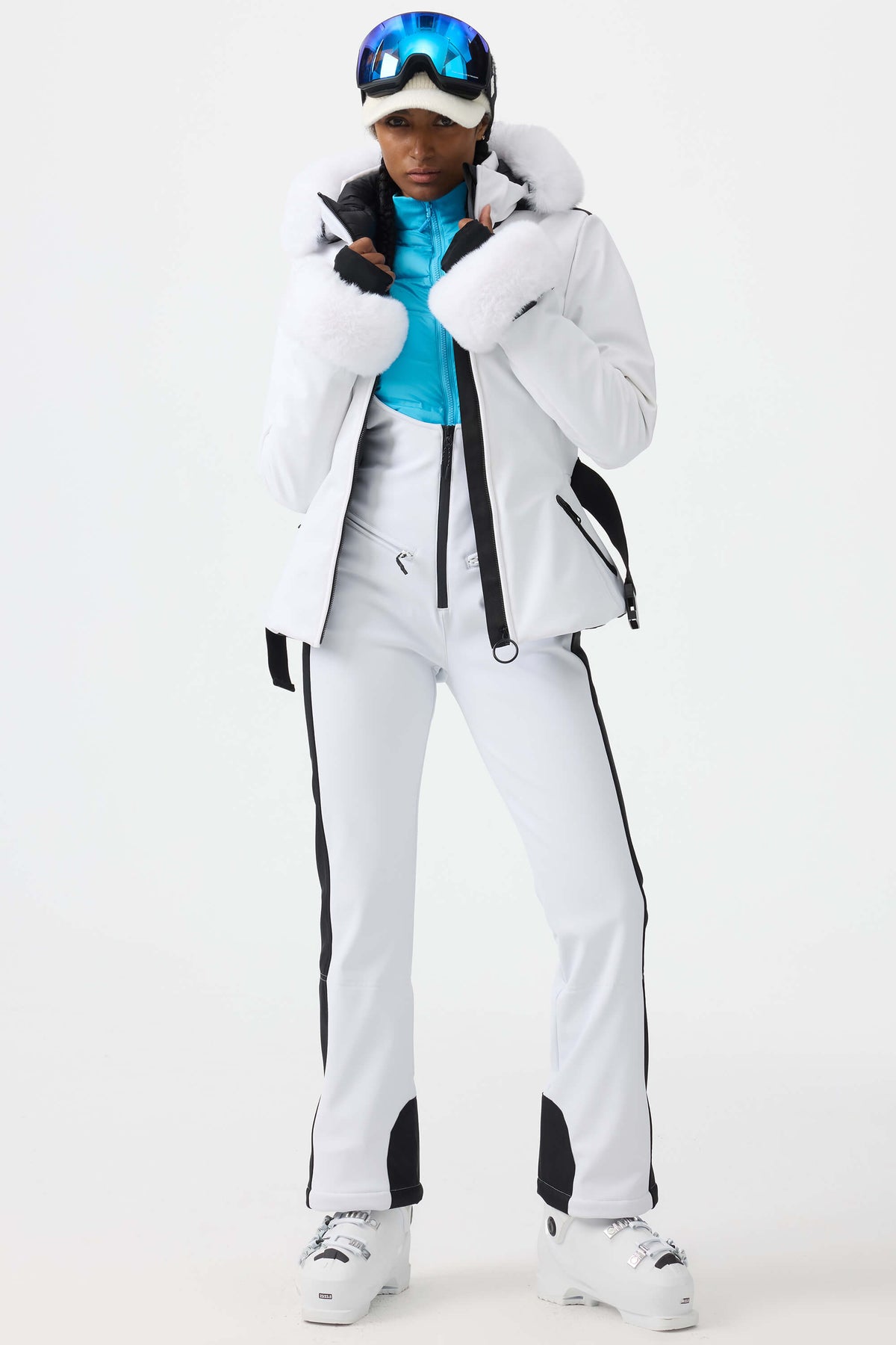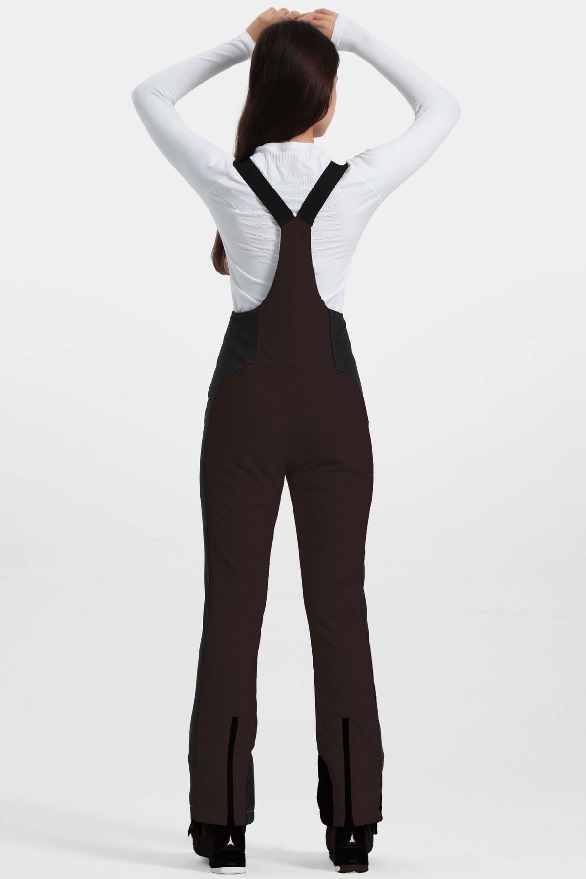The slim ski bibs are made of 100% polyester fabric, providing warmth and waterproof protection. The bib features two pockets, and the center zipper is designed with a fully sealed waterproof zipper. The hem is equipped with an abrasion-resistant protection device.