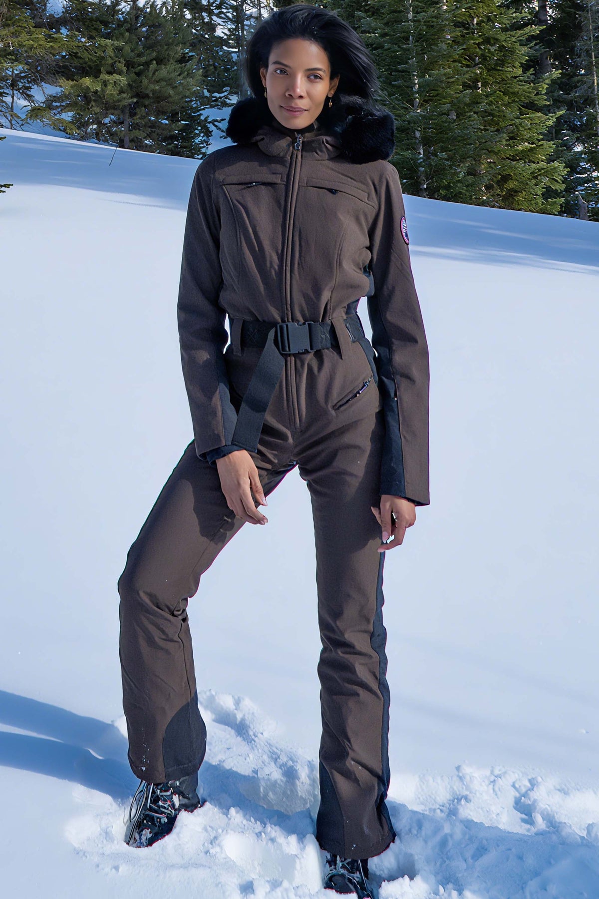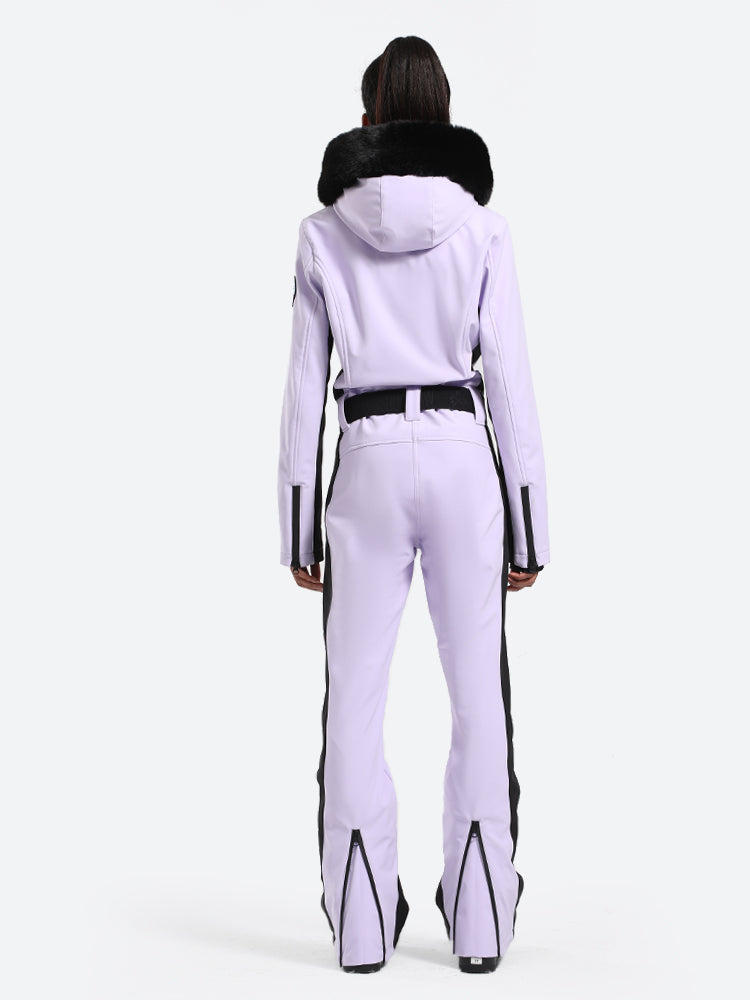 Women's Minimalist Faux Fur Khaki Down One-piece Ski Suits