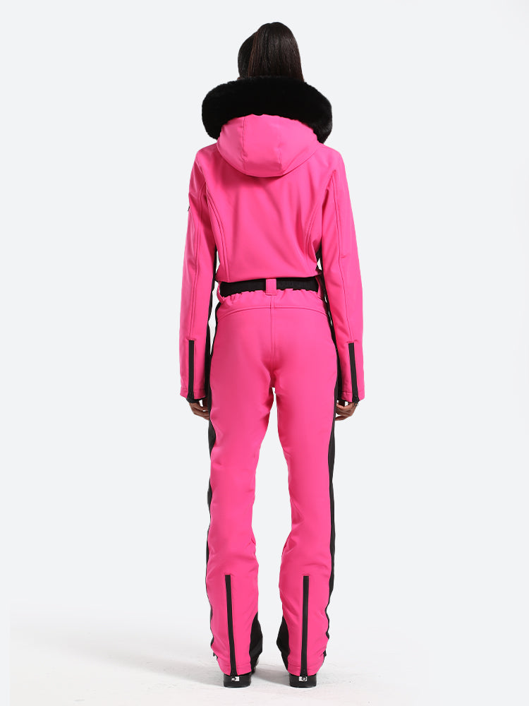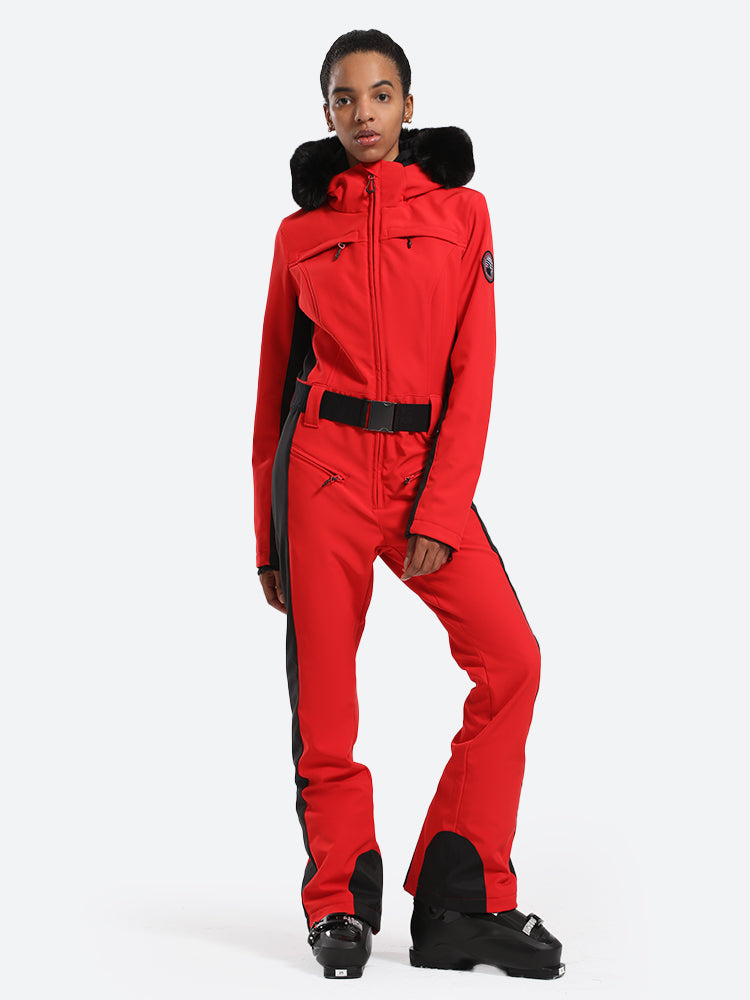 Women's Minimalist Faux Fur Red Down One-piece Ski Suits