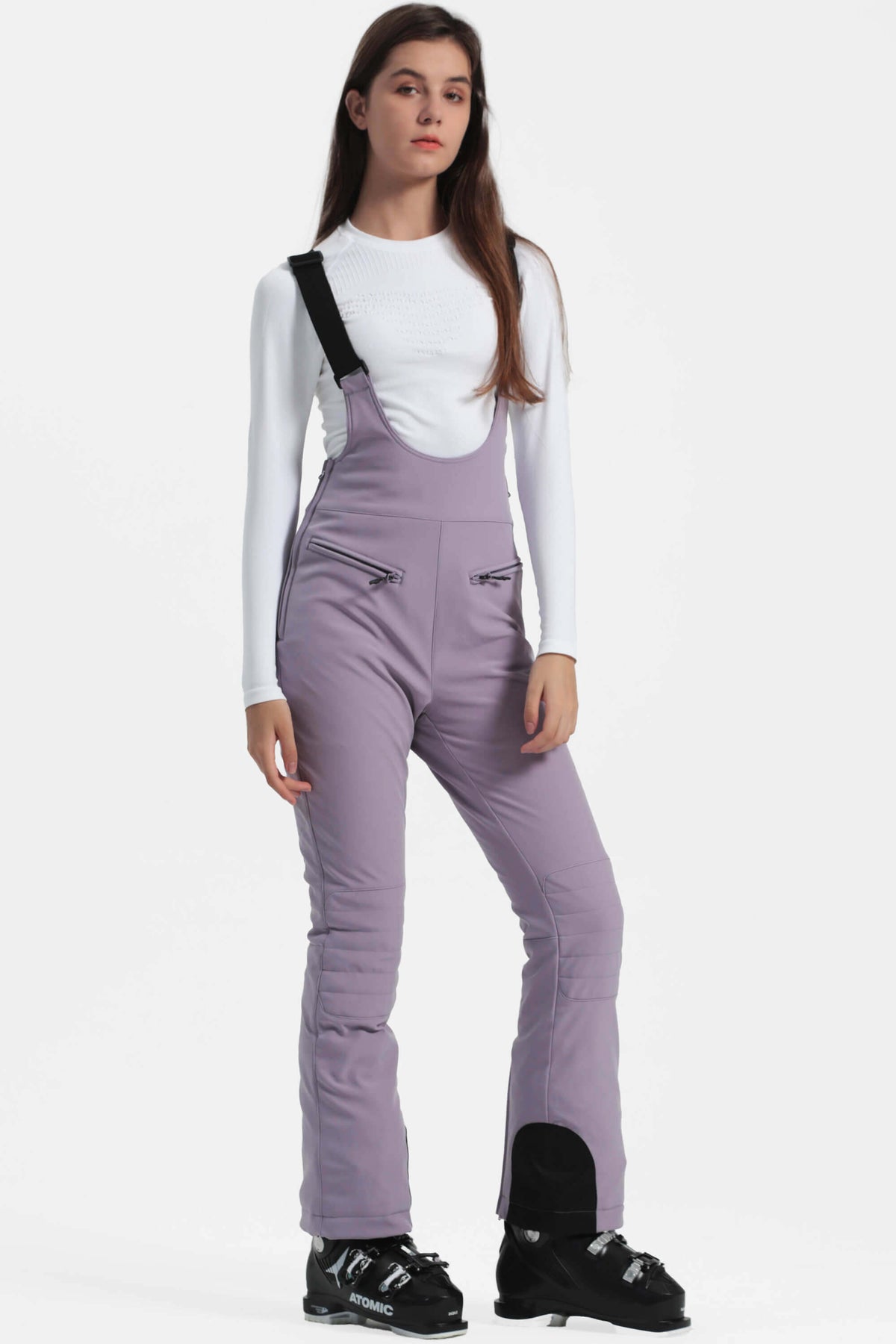 The GSou Snow women's ski bibs feature a slim-fit design with a warm fleece lining. The waist has zippers on both sides, while the knees and hem are reinforced for abrasion protection. The hem includes a zipper and built-in gaiters.These bibs are perfected with durable, stretchy suspender webbing that's as comfortable as it is functional.