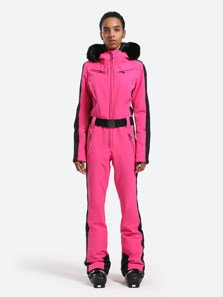 Women's Slim-Fit Stretch Faux Fur Fuchsia One-Piece Ski Suit