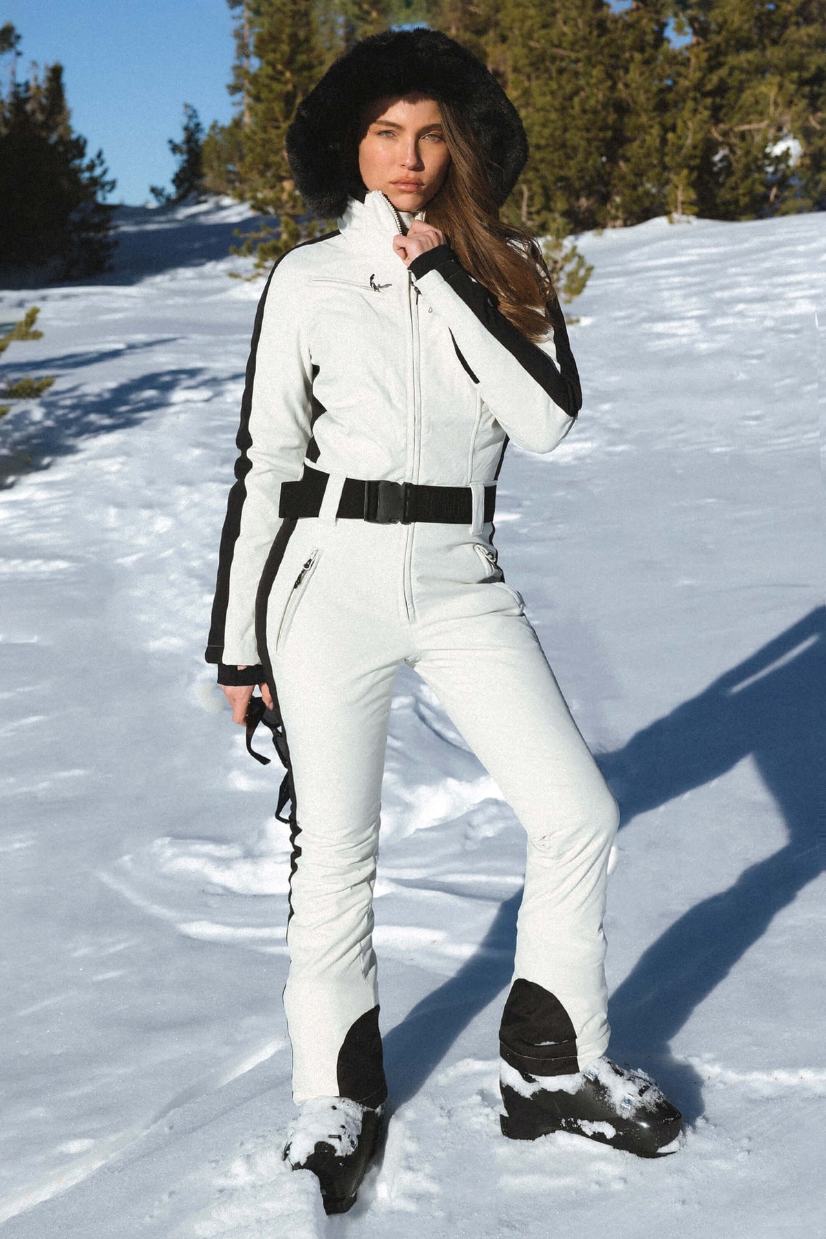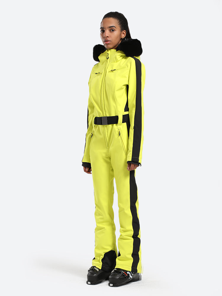 The GSou Snow one-piece ski suit, designed for a slim fit, boasts a removable faux fur hood, providing a range of styling possibilities. Made from stretchy fabric, it allows for unrestricted movement while skiing. A soft chin guard, interior pockets, cuff pockets, and waterproof zippers make this ski suit an excellent choice.