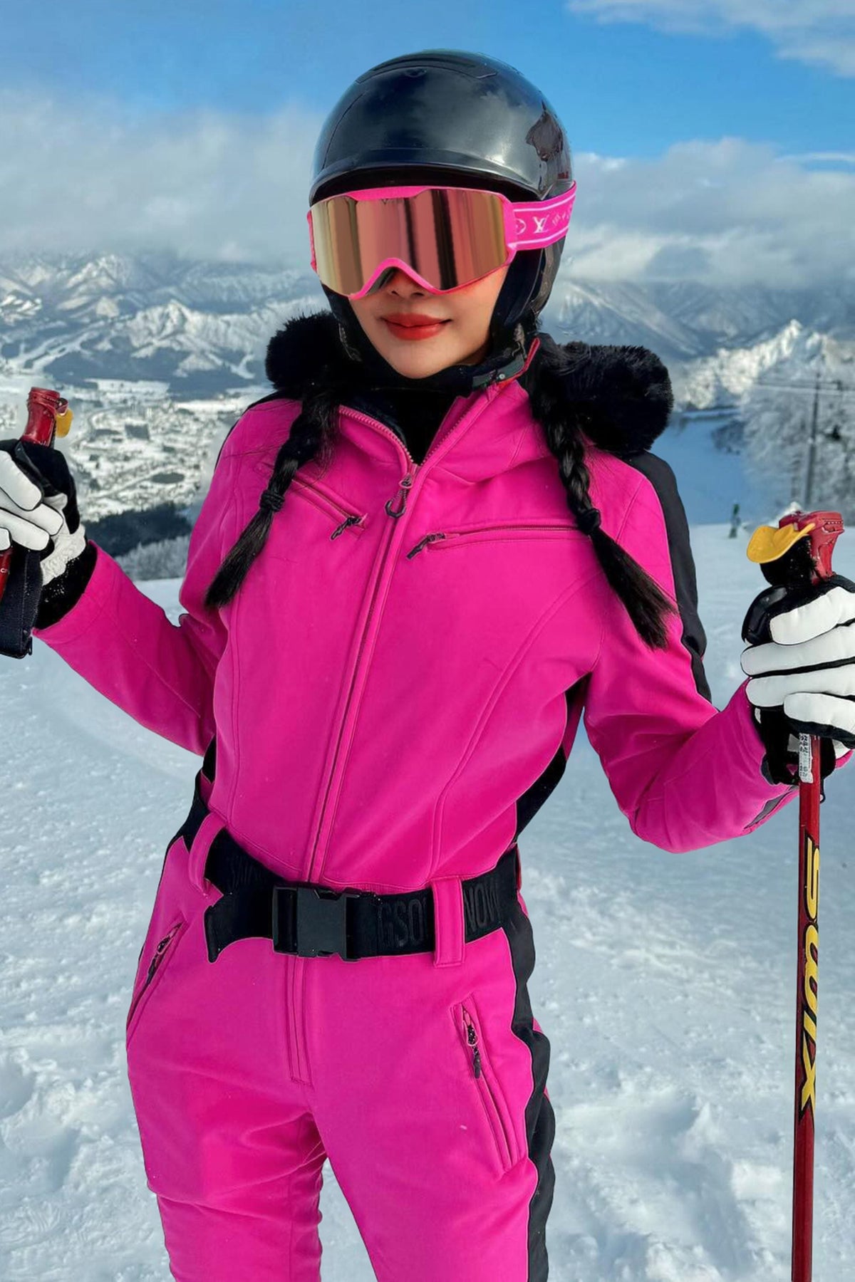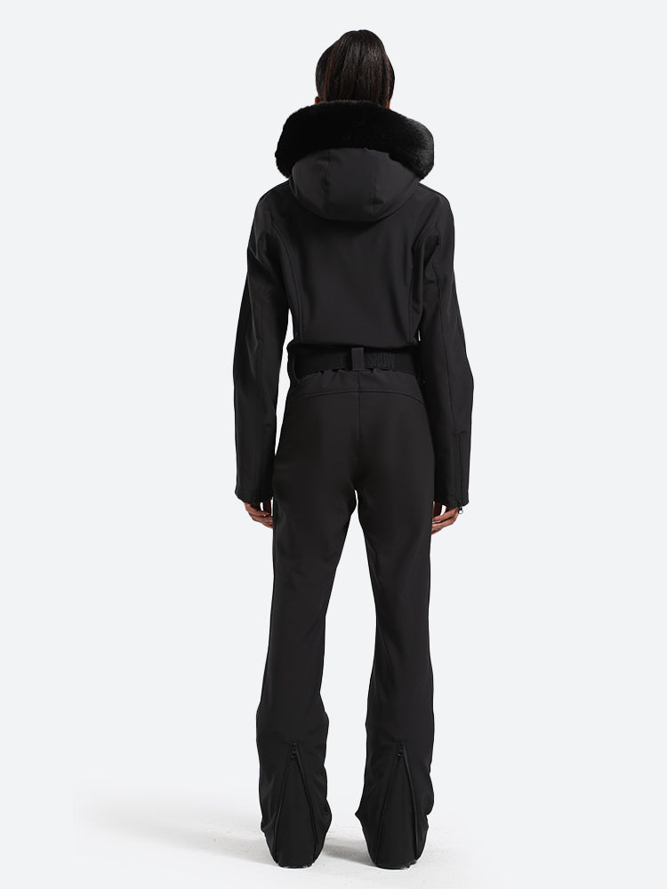 The GSou Snow one-piece ski suit, designed for a slim fit, boasts a removable faux fur hood, providing a range of styling possibilities. Made from stretchy fabric, it allows for unrestricted movement while skiing. A soft chin guard, interior pockets, cuff pockets, and waterproof zippers make this ski suit an excellent choice.