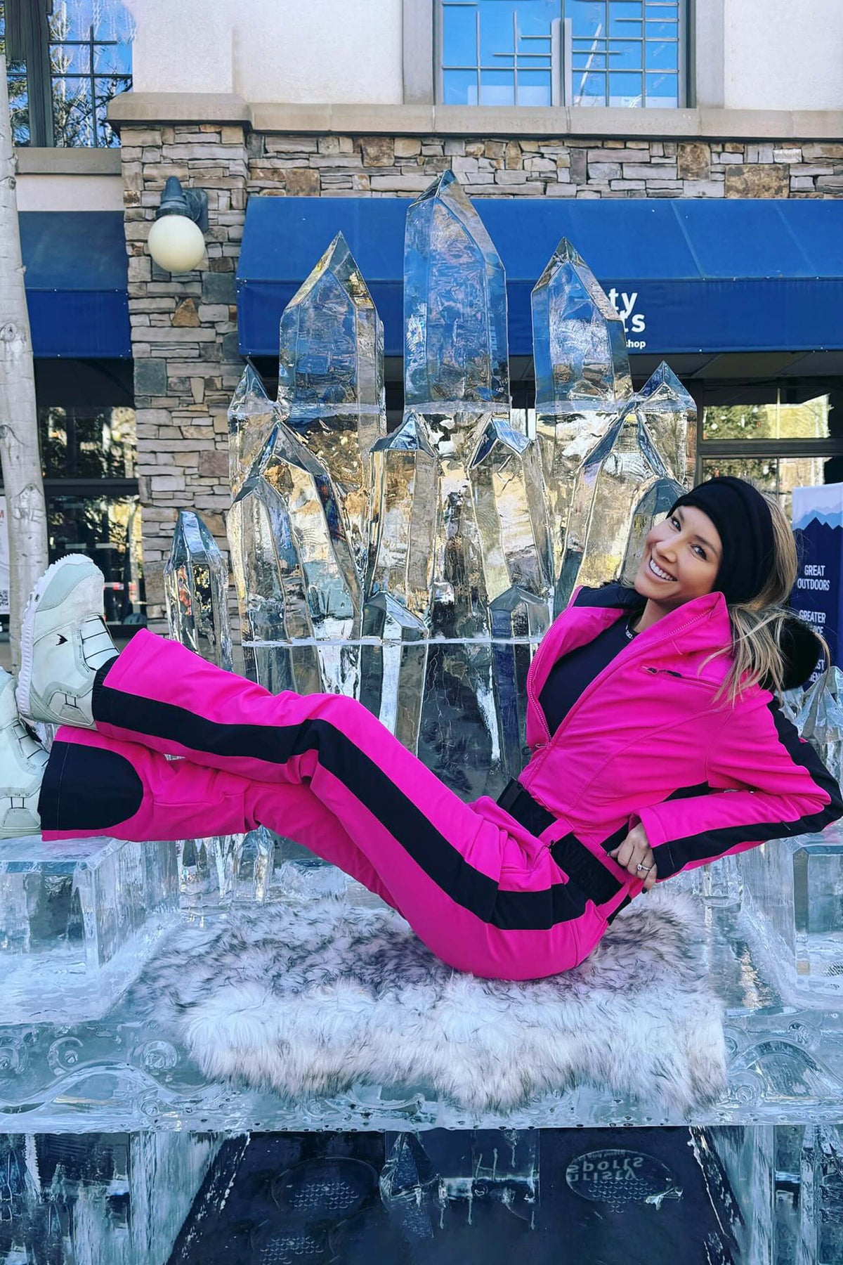Women's Slim-Fit Stretch Faux Fur Tan Houndstooth One-Piece Ski Suit