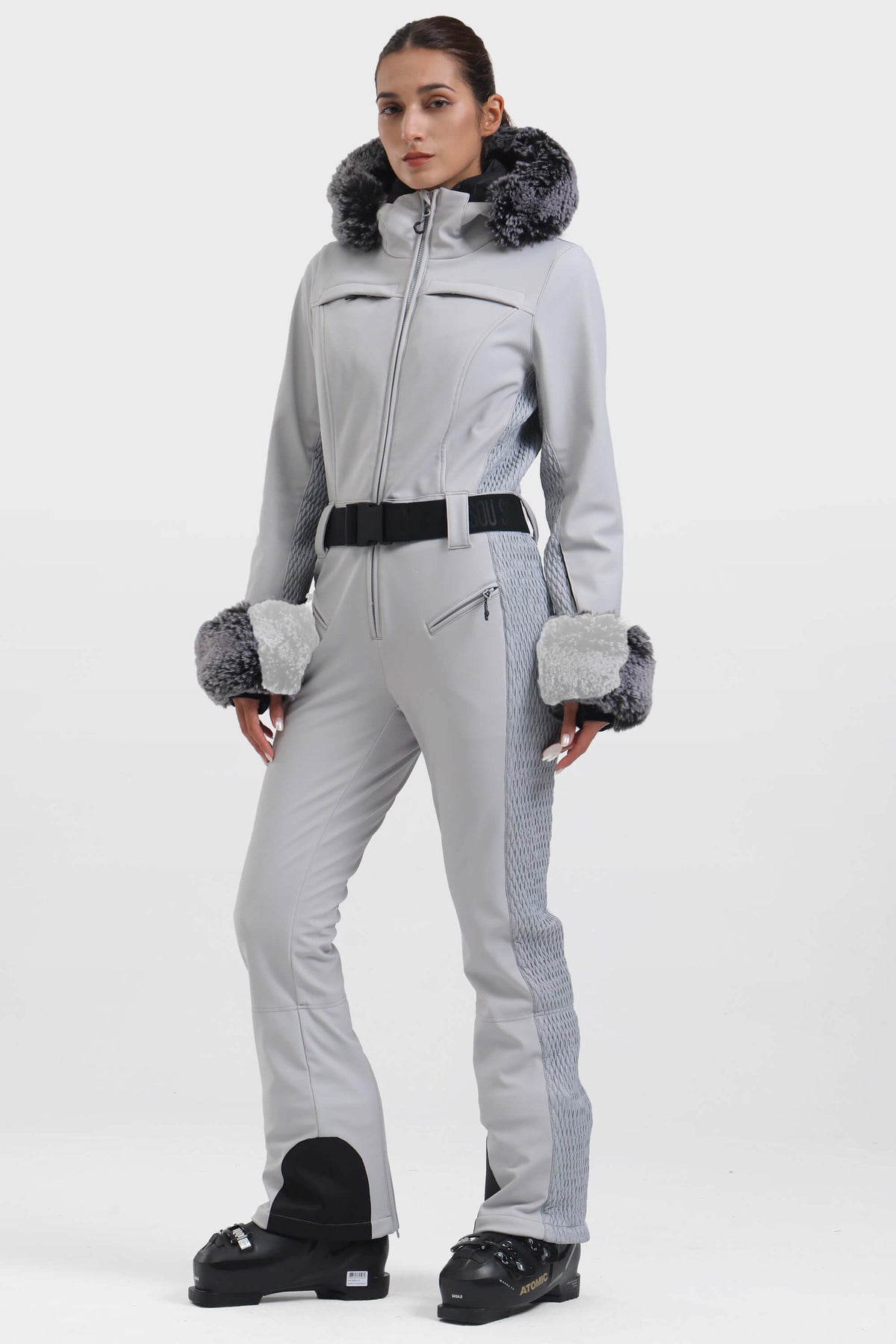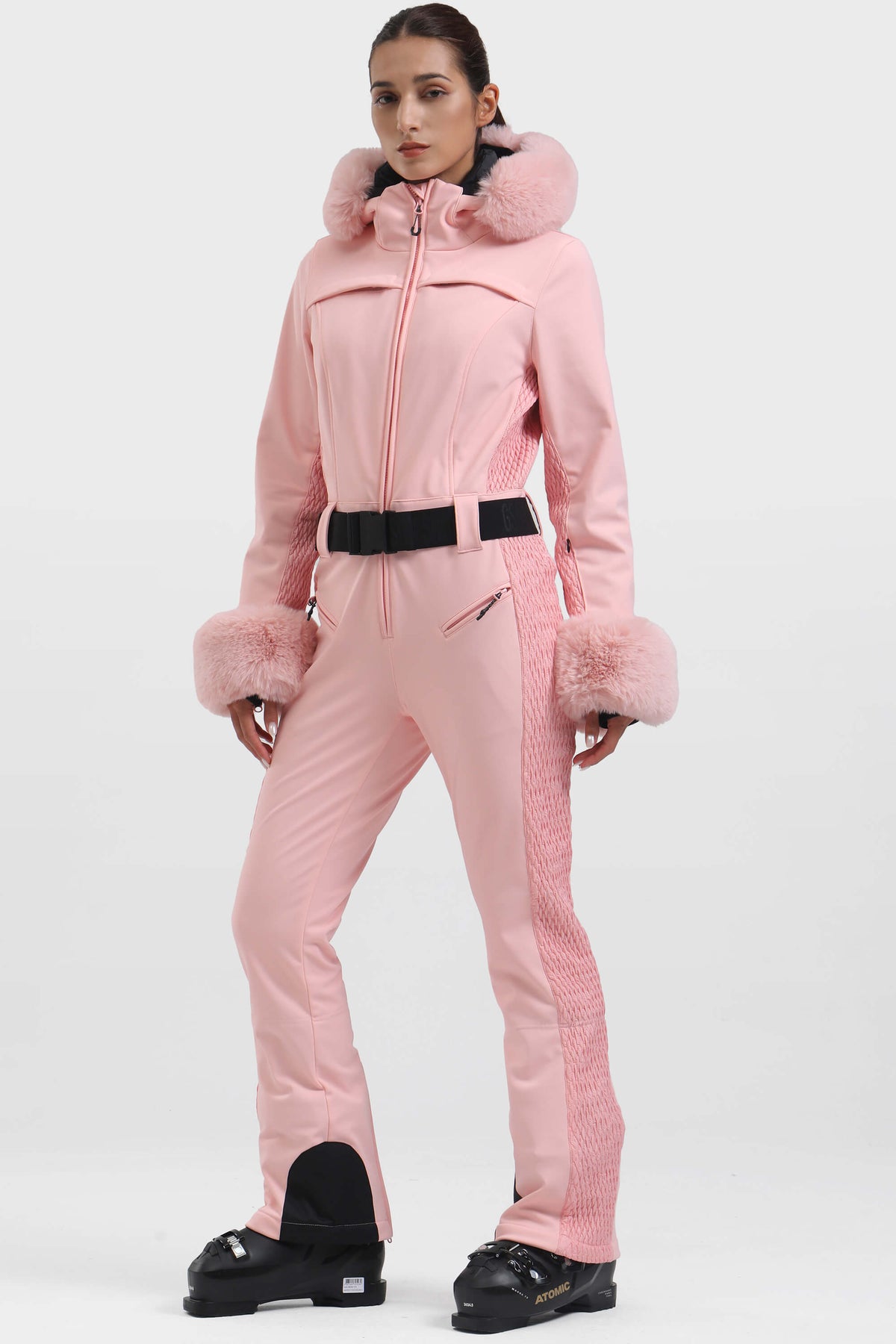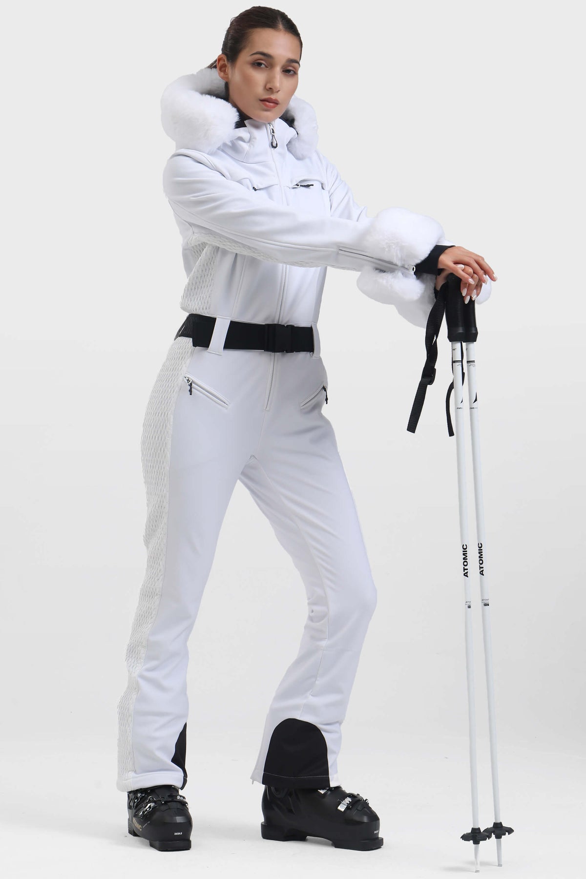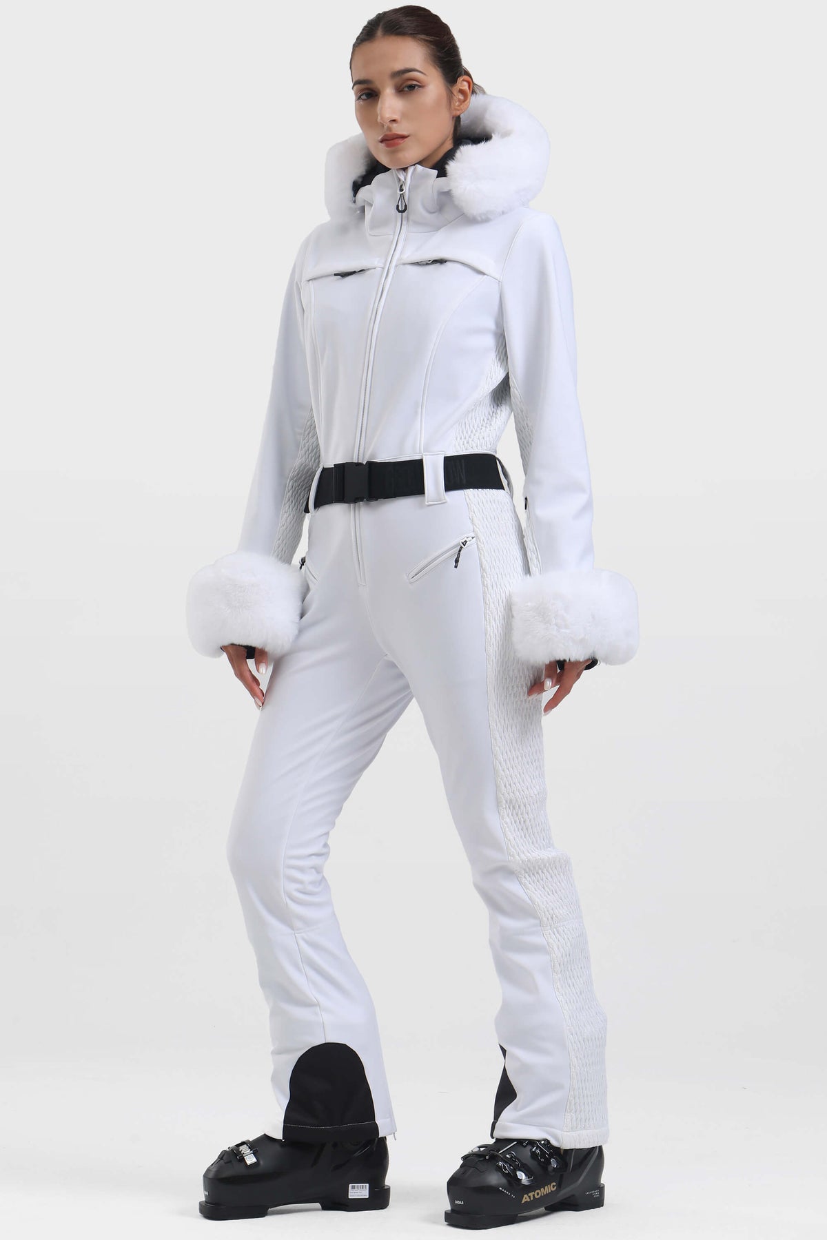 The one-piece ski jacket features an extensive faux fur design, adding an elegant touch to your alpine skiing look. The removable faux fur offers versatile styling, while the waterproof fabric ensures you stay dry. Plus, the padded lining provides warmth for cold days on the slopes.