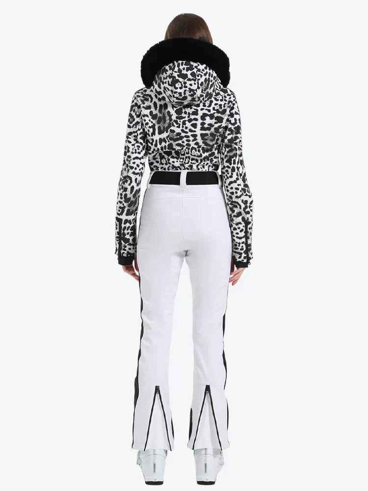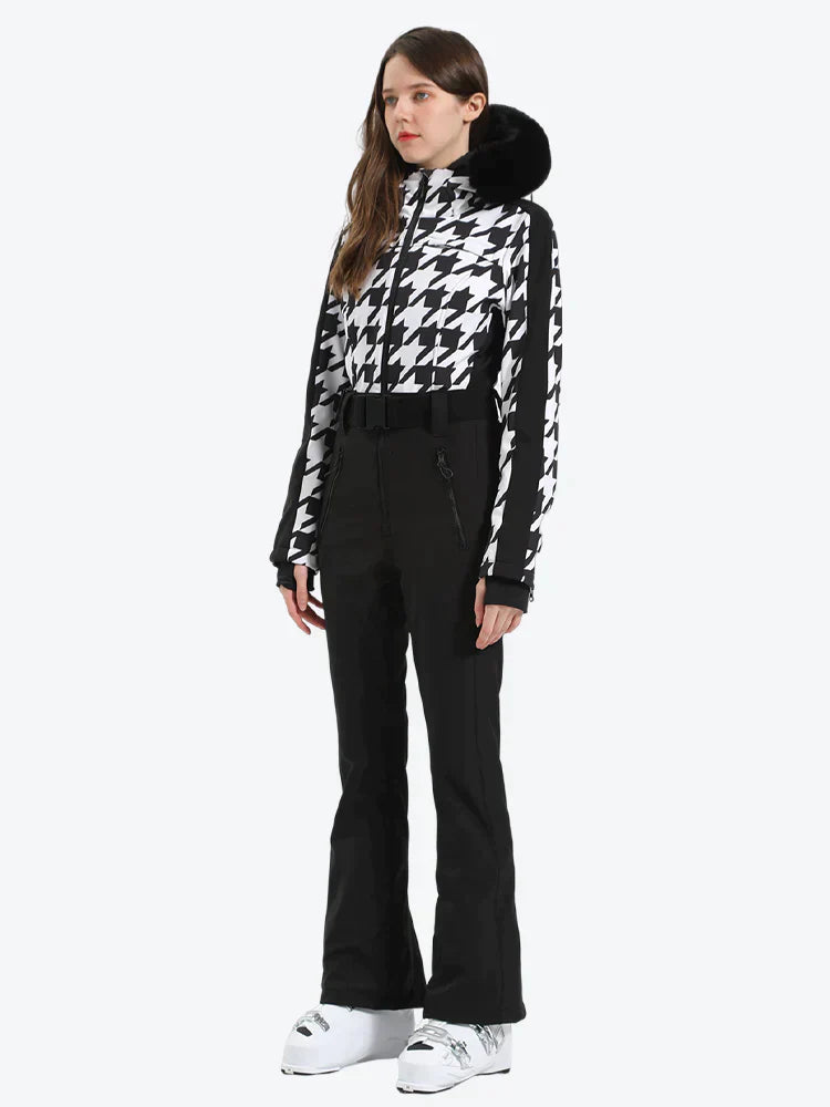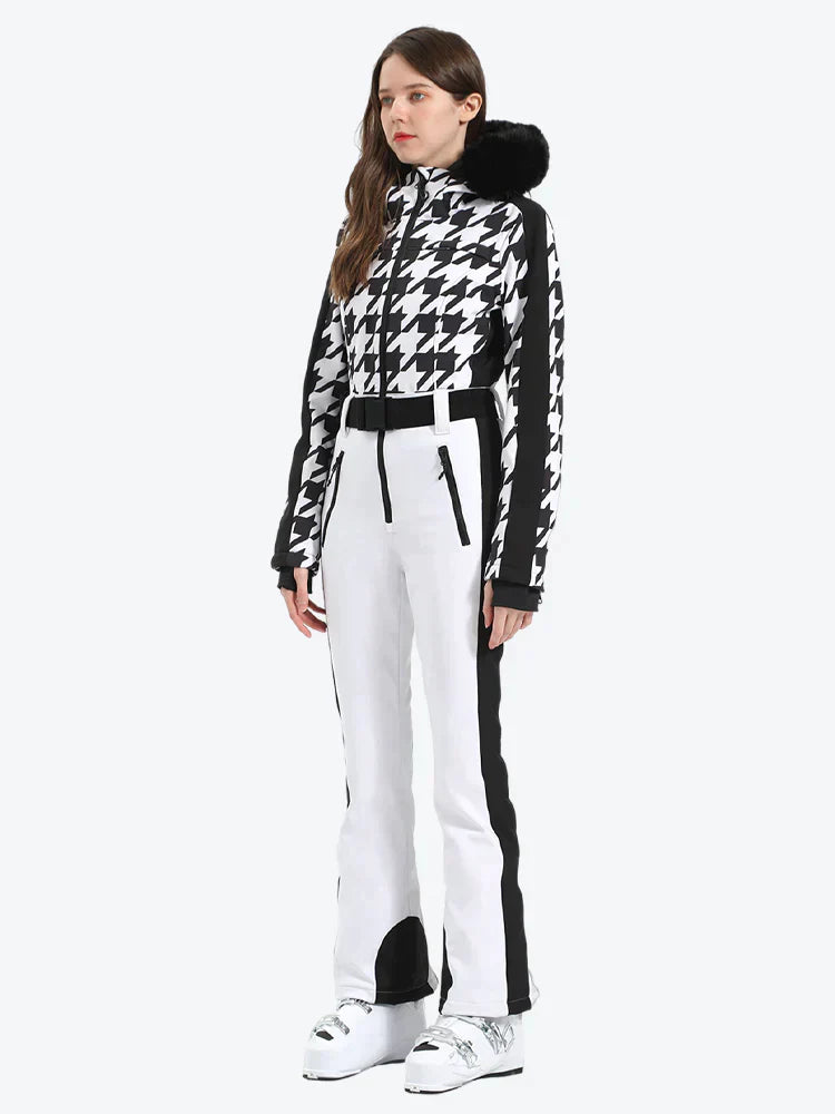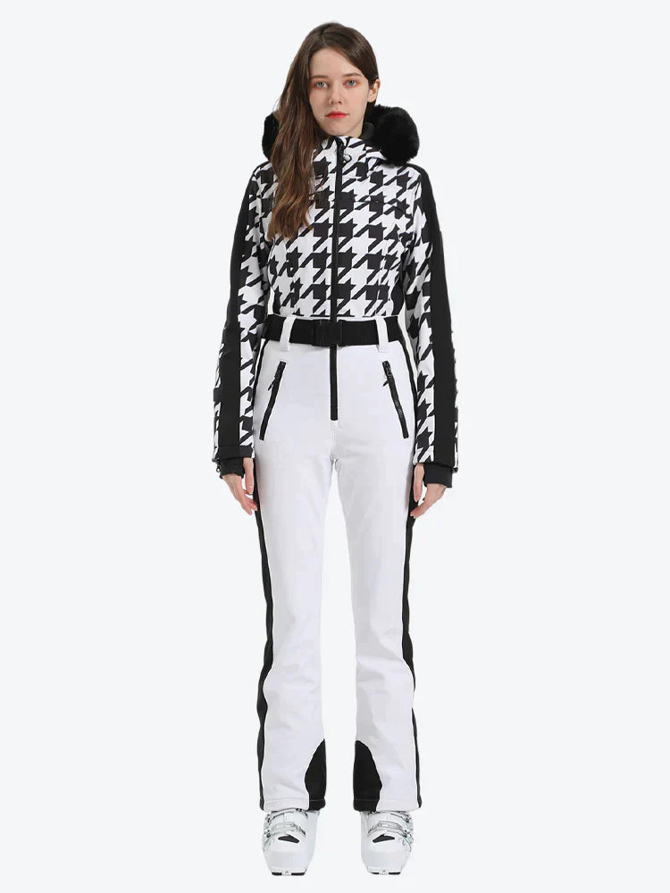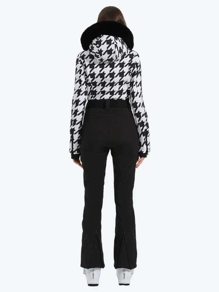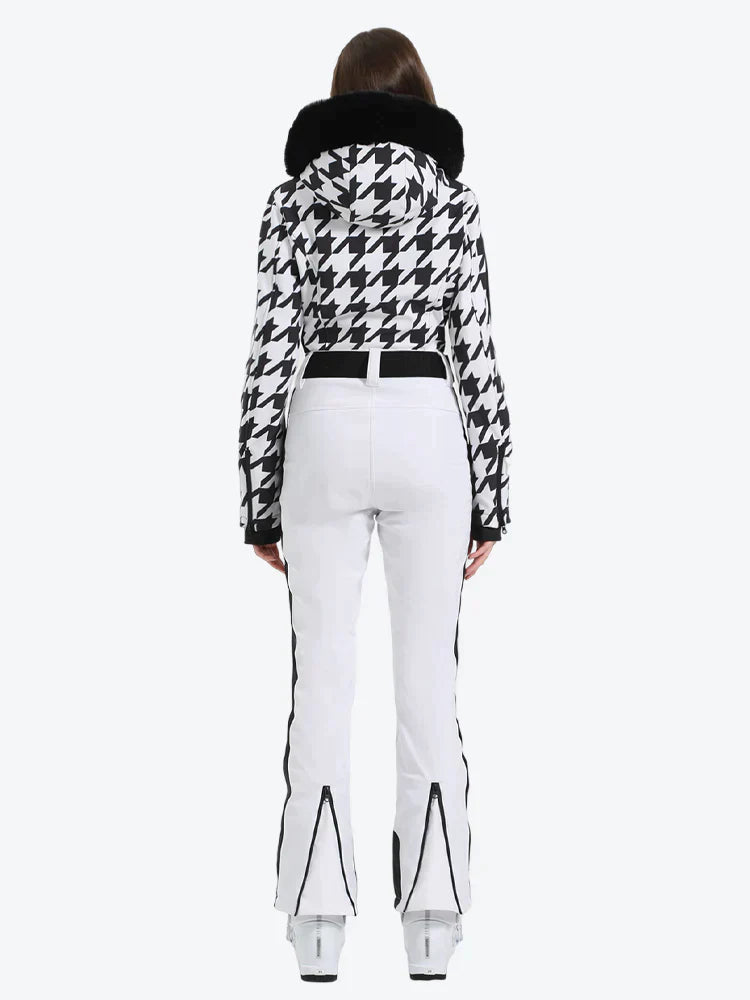 Damen-Skianzug aus Kunstfell mit Kapuze und Hahnentrittmuster in Weiß