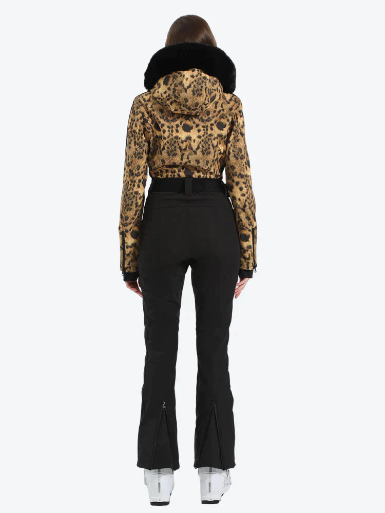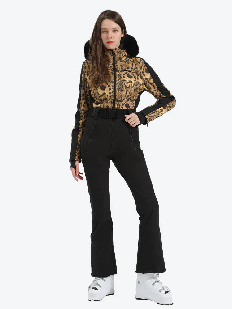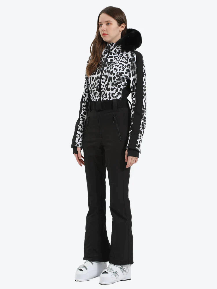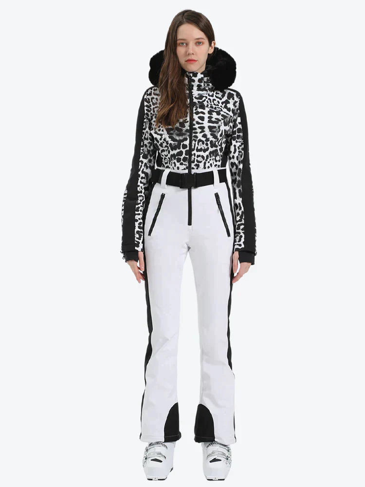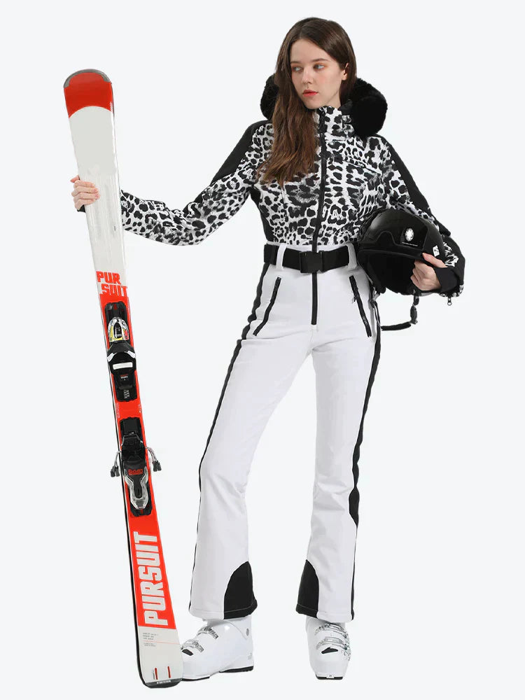 This women's One-Piece ski suit is made from 100% polyester and insulated with 30g of duck down for superior warmth. It includes a hood with adjustable features, removable faux fur, waist belt loops, and an adjustable elastic waistband for a comfortable fit.