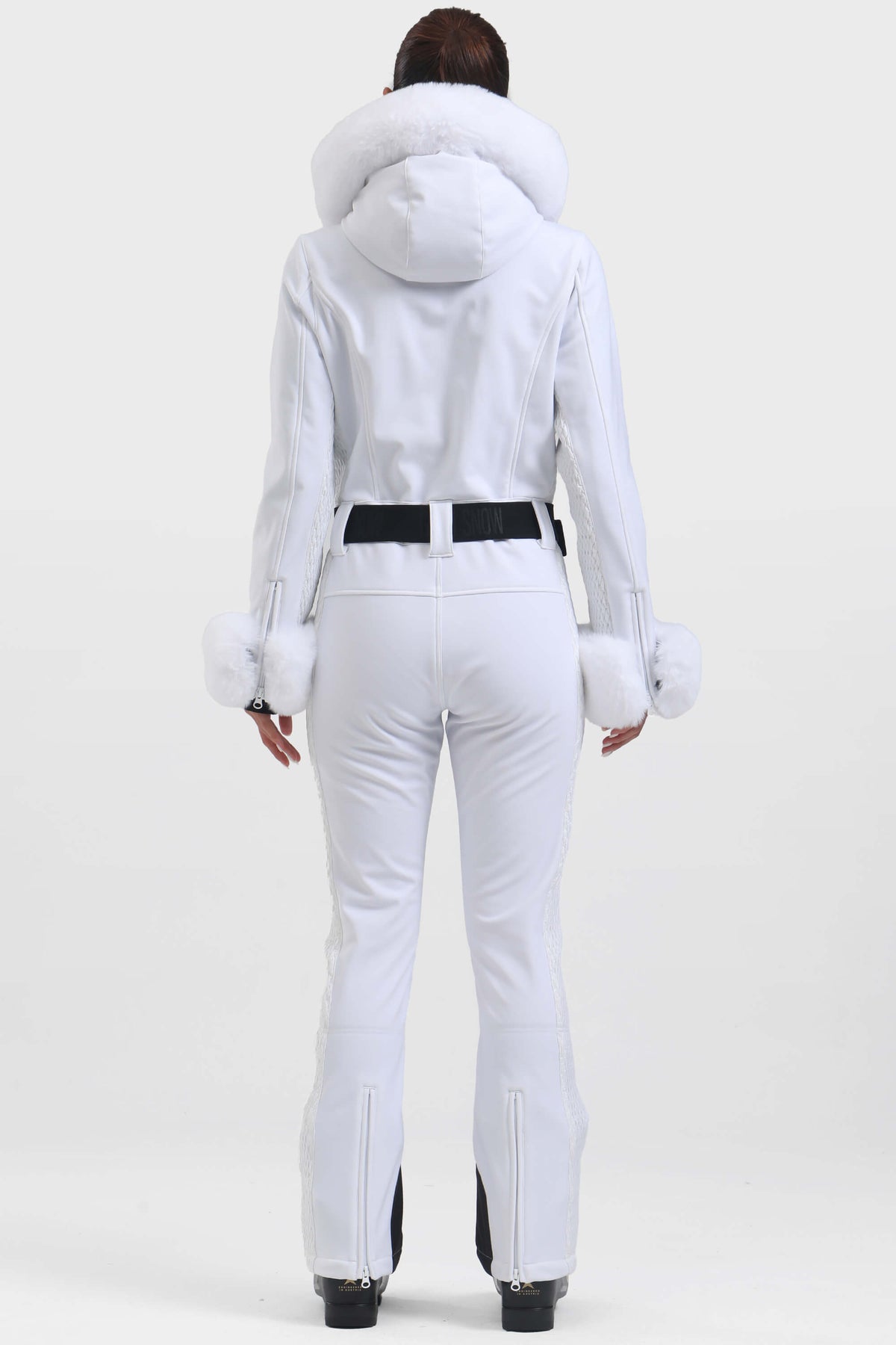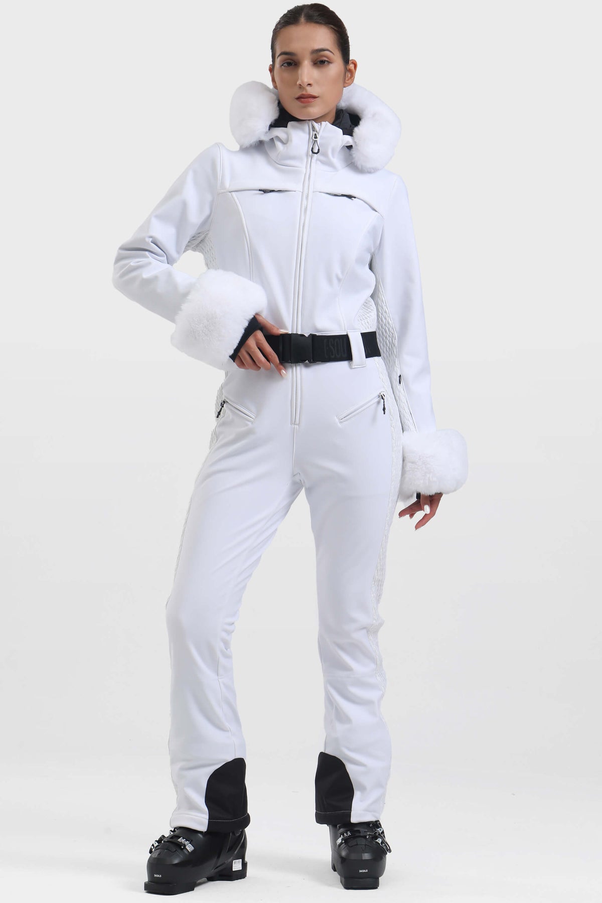 Weißer, wasserdichter Einteiler-Skianzug für Damen aus Kunstfell mit Raffungen