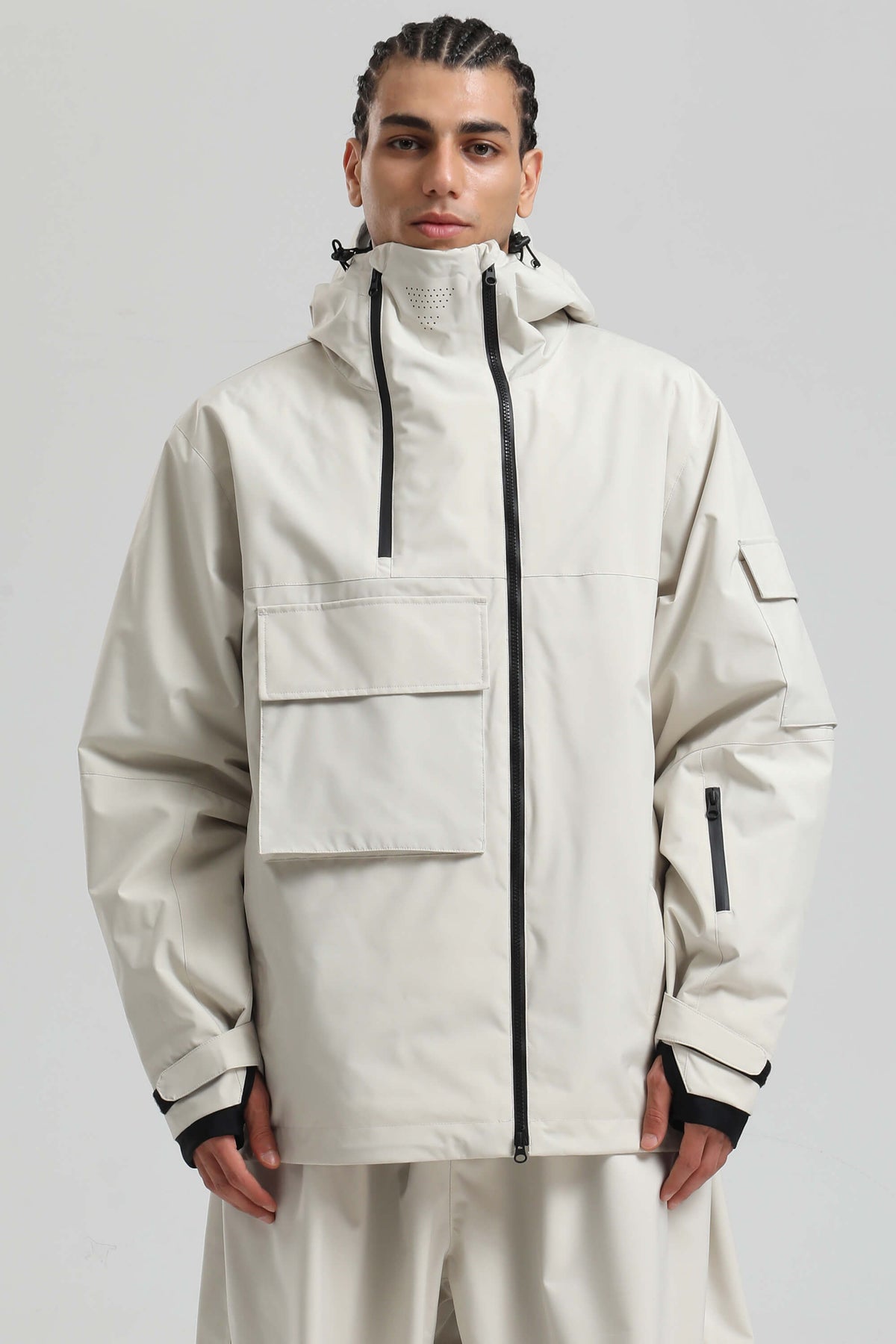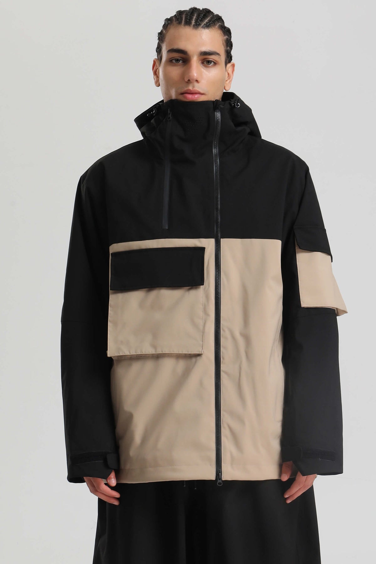 Herren-Snowjacke in Khaki mit asymmetrischem Reißverschluss, Utility-Taschen und wasserdicht