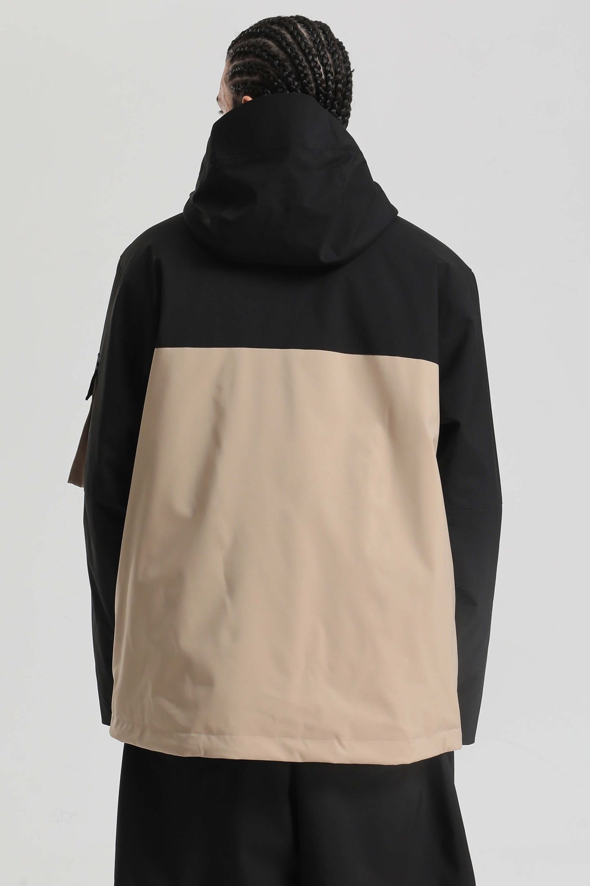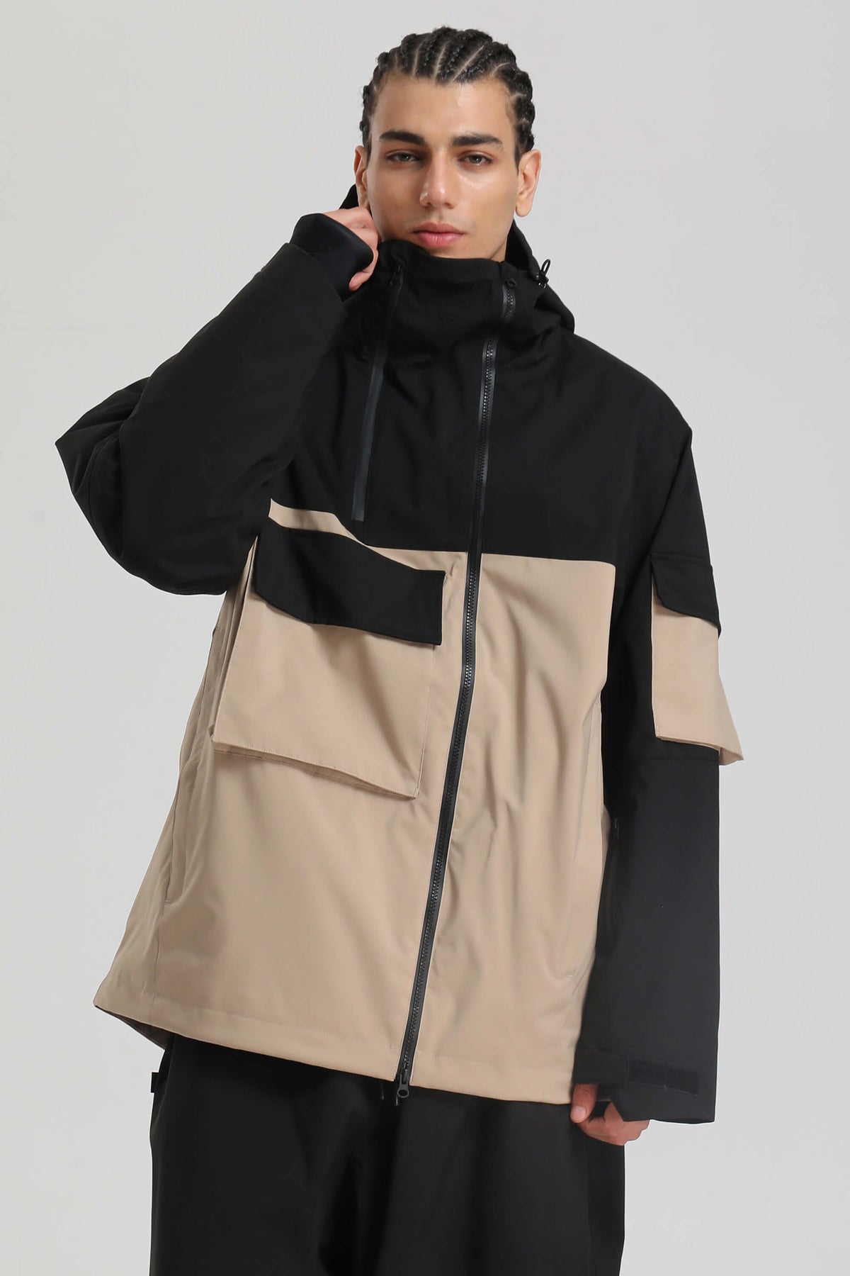 Chaqueta impermeable para hombre con cremallera asimétrica y bolsillos utilitarios, en color negro y caqui.