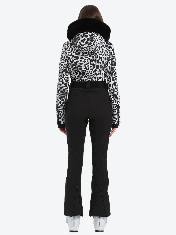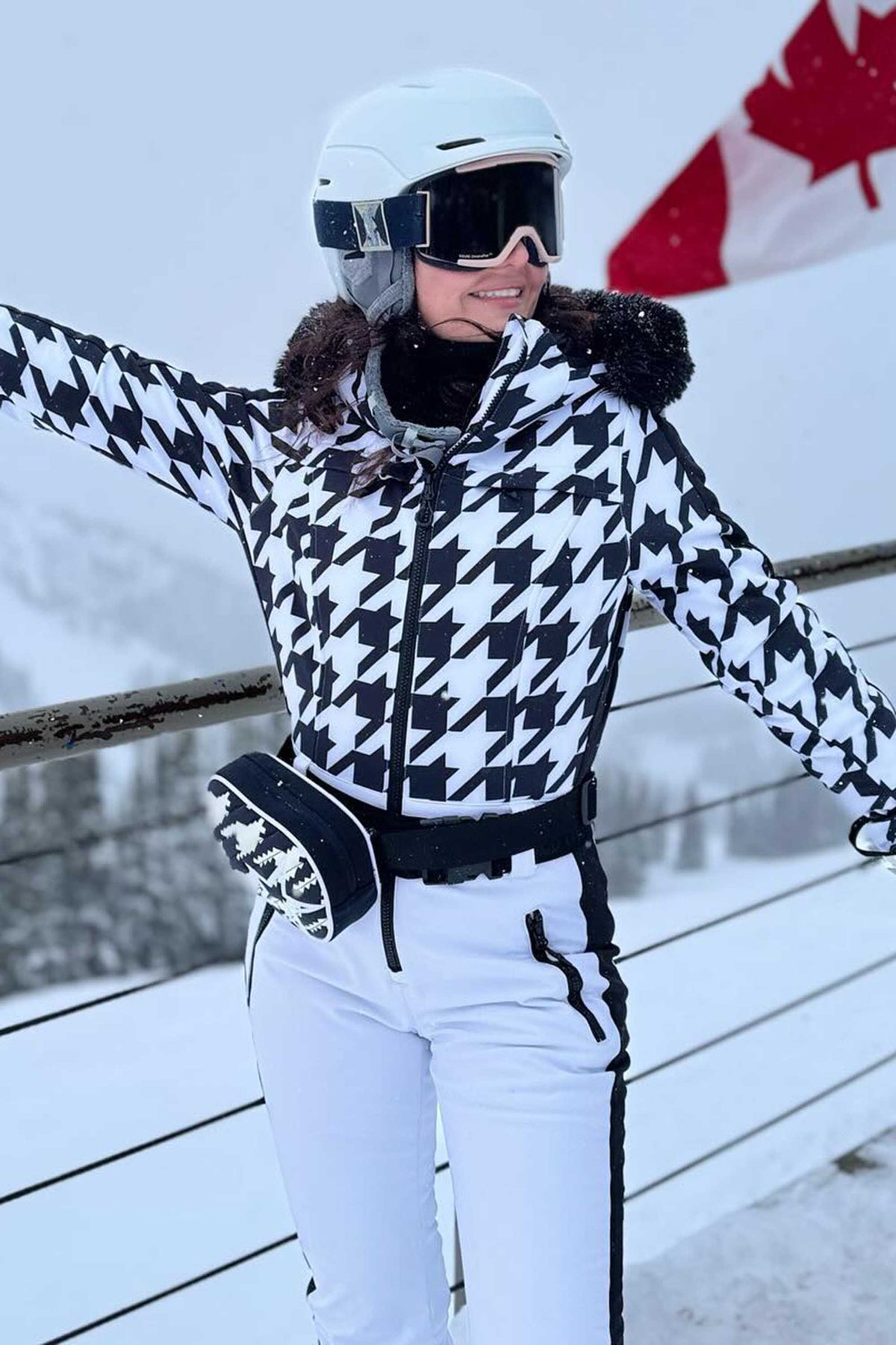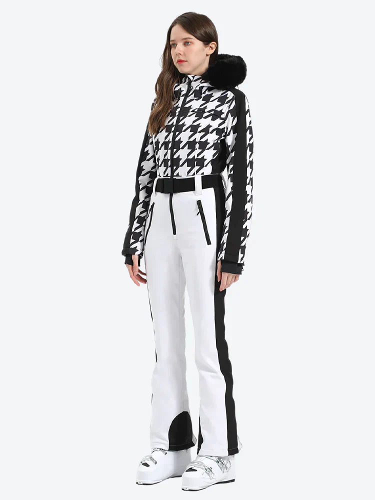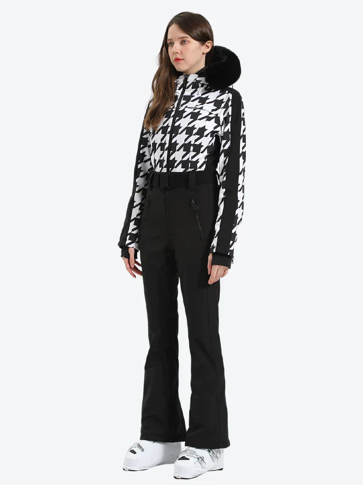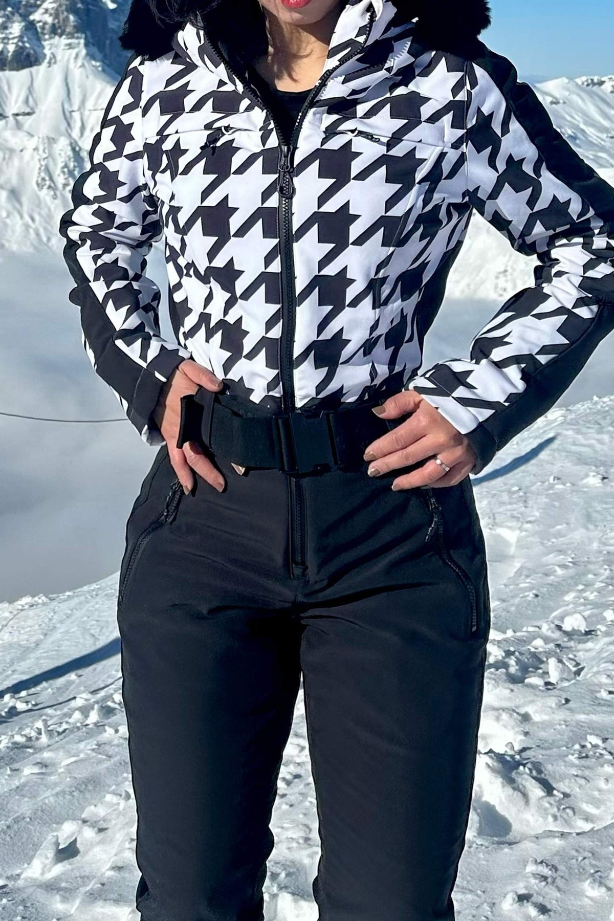 Traje de esquí de una pieza con capucha de pelo sintético negro y estampado de pata de gallo para mujer