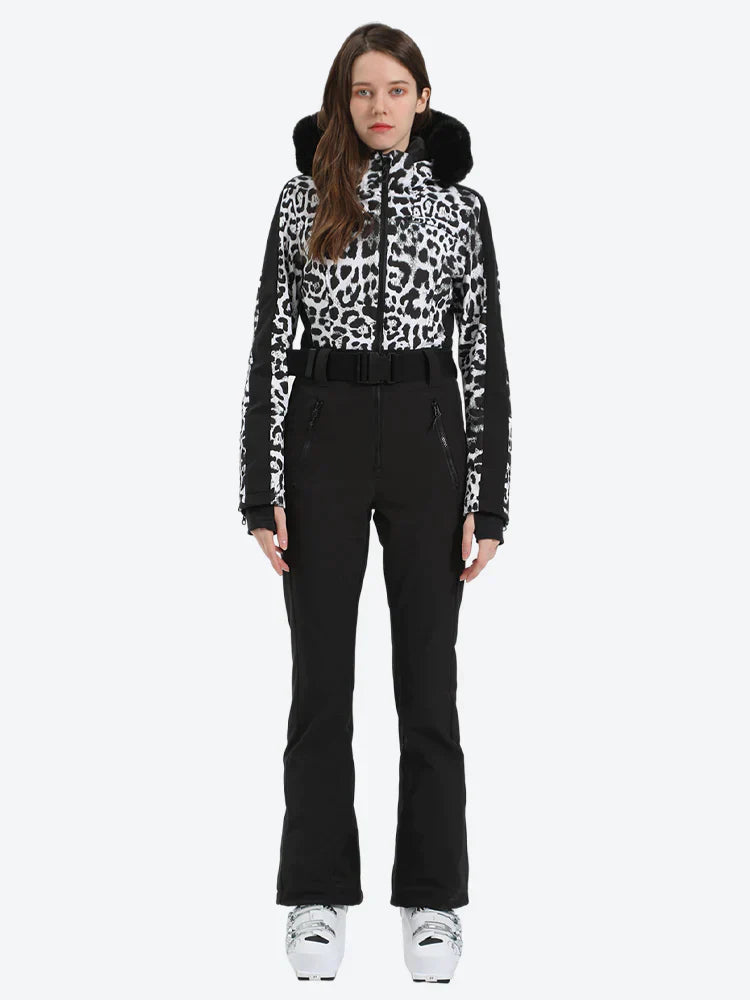 This women's One-Piece ski suit is made from 100% polyester and insulated with 30g of duck down for superior warmth. It includes a hood with adjustable features, removable faux fur, waist belt loops, and an adjustable elastic waistband for a comfortable fit.