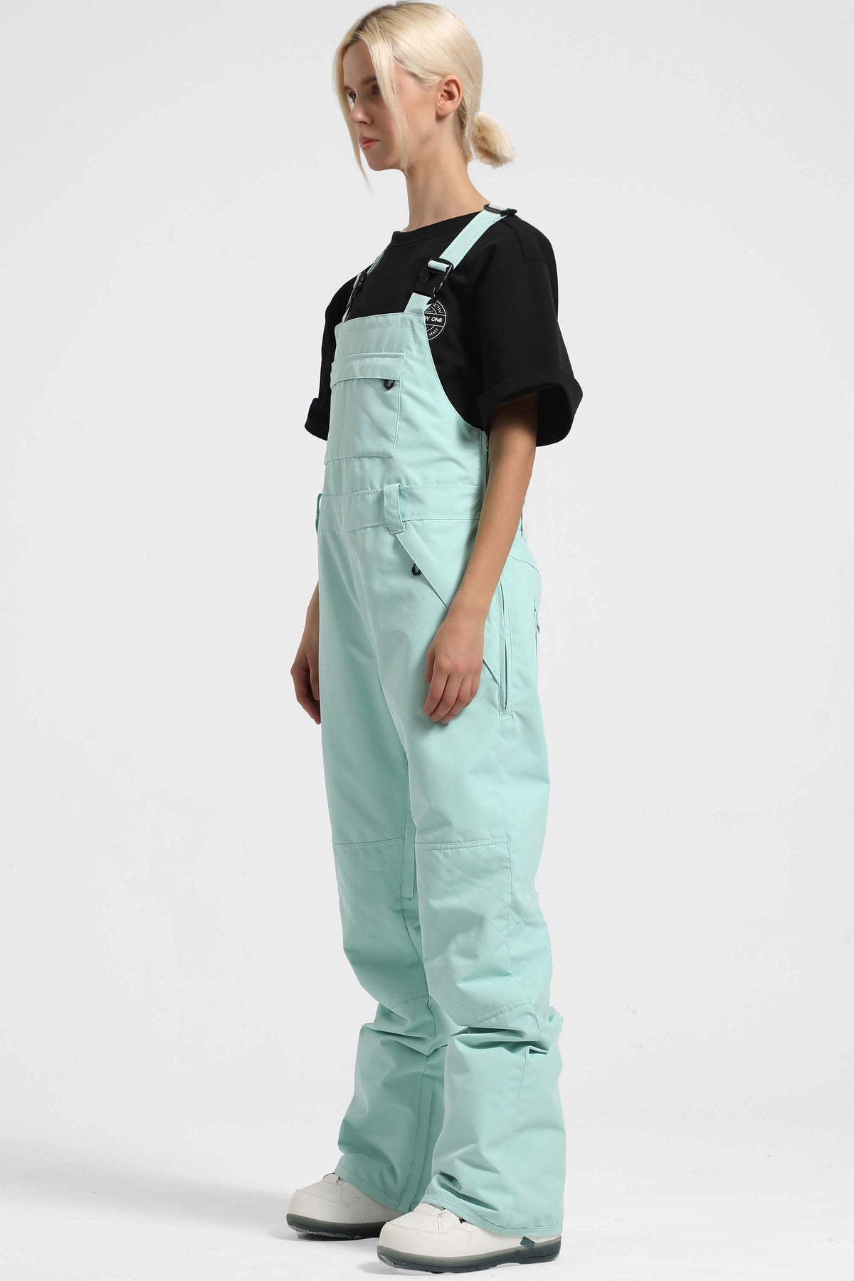 Peto de nieve holgado para mujer, color verde menta, ligero, transpirable y con múltiples bolsillos.