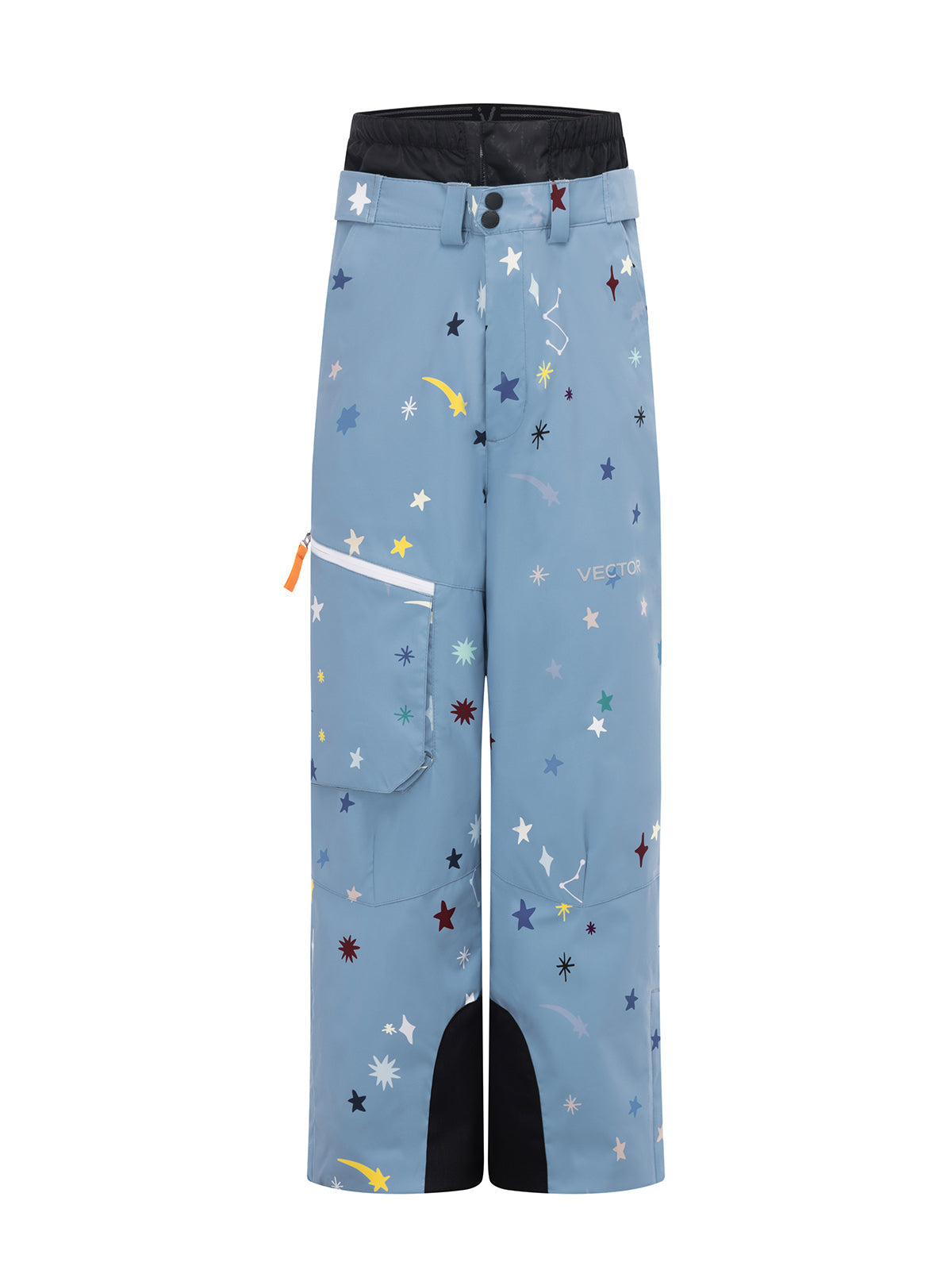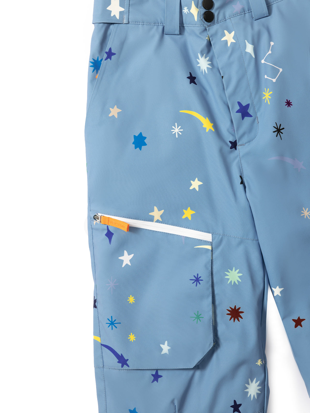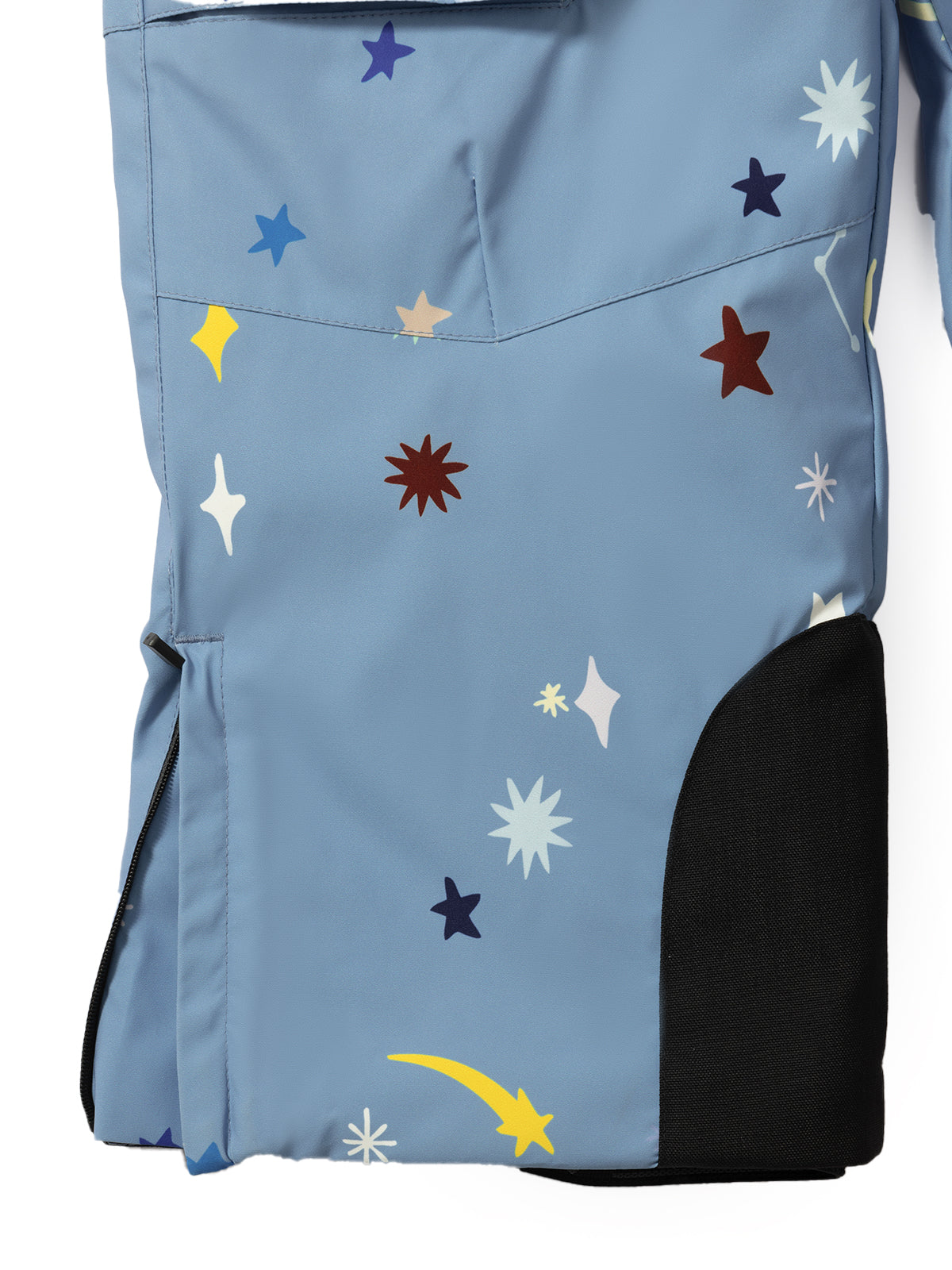 The Kids' Cosmic Smartgrow 2L Pants are mid-warmth, grow-with-me pants featuring a star-themed design that creates a "walking mini-universe" for children. With 80g/m² insulation, they withstand -30°C temperatures while remaining breathable. The Smartgrow™ system adjusts length (up to 20cm) and waist to fit growing kids. Offering 20k waterproofing/8k breathability and a C0 PFC-free coating, they shed snow effectively. COROURA 500D nylon reinforces cuffs, while pre-shaped knees with removable SBR pads and extra seat padding provide protection during play.