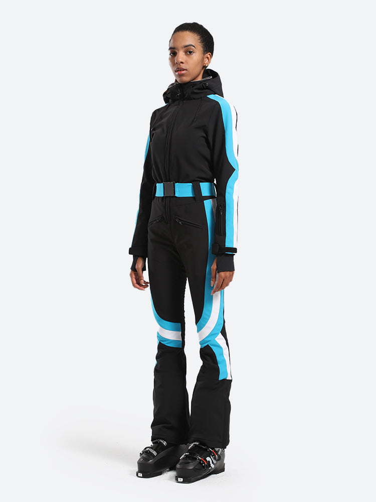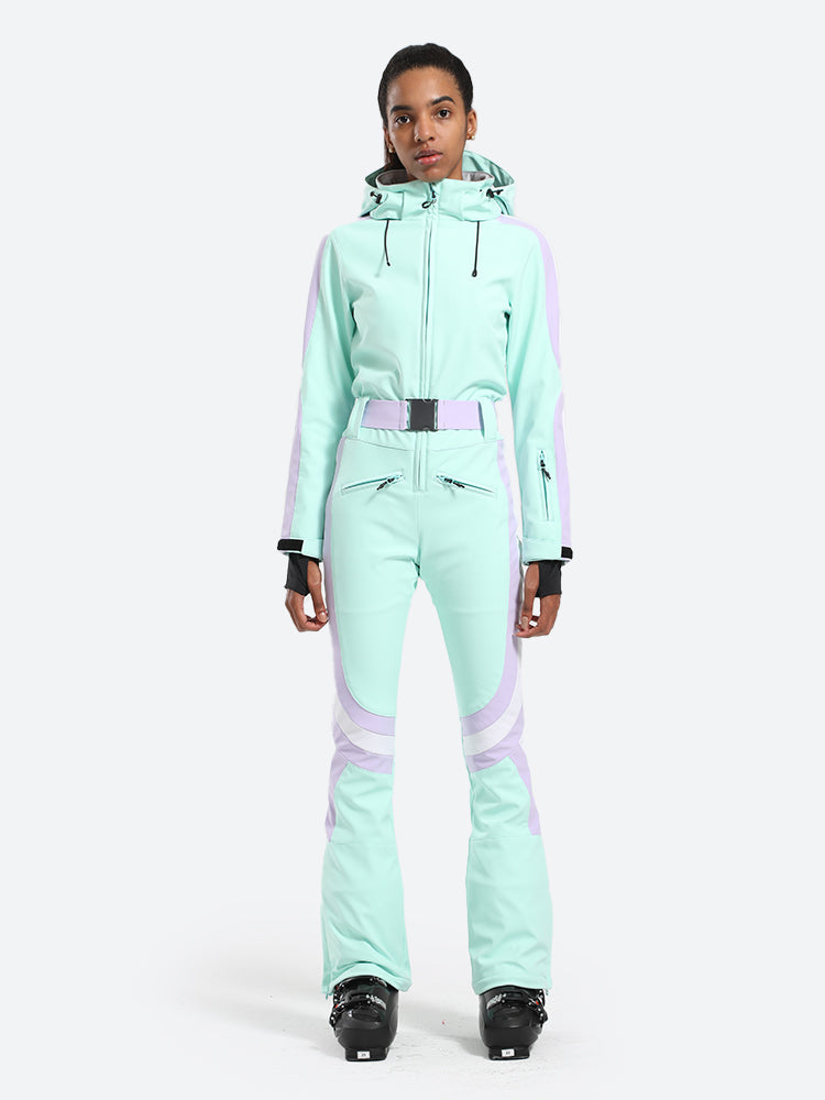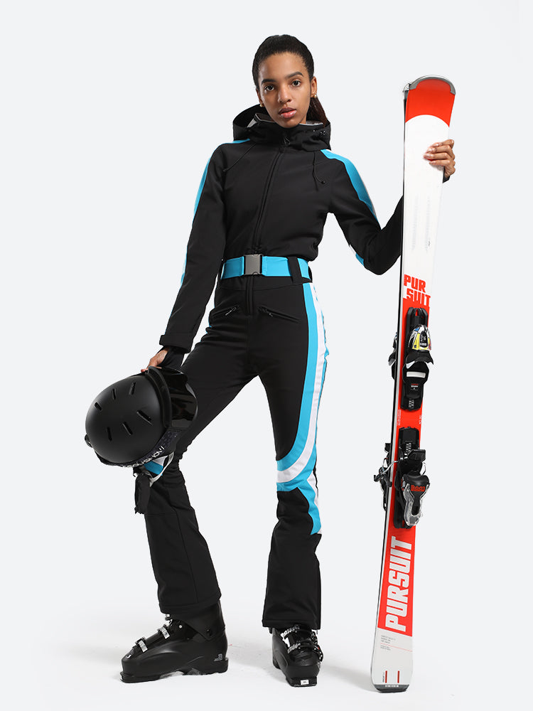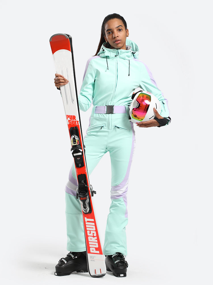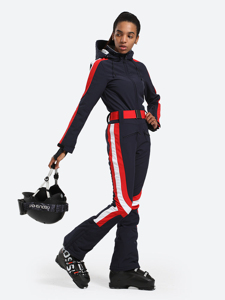 The GSou Snow one-piece ski suit has a dynamic and streamlined appearance, with a clean, modern design that often features bright colors and high-contrast combinations to enhance visibility on the slopes, the outfit appears sleek and fashionable on the slopes.