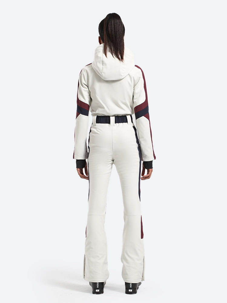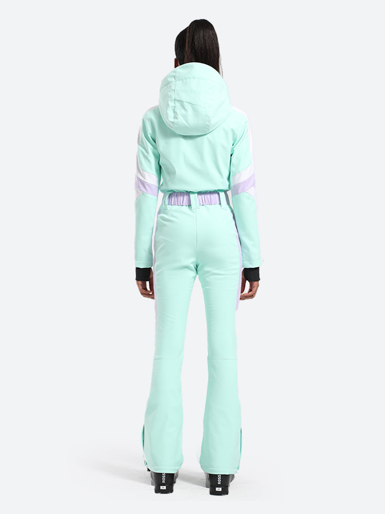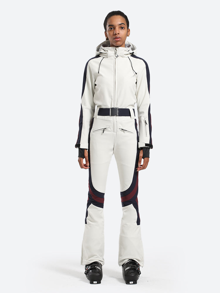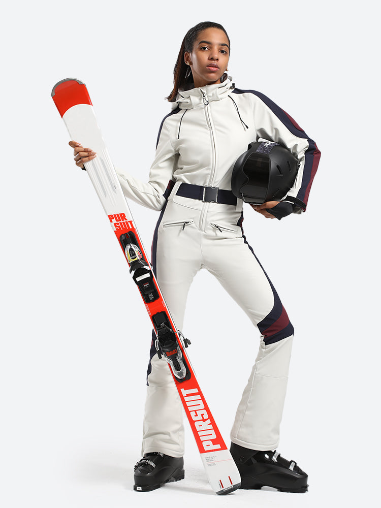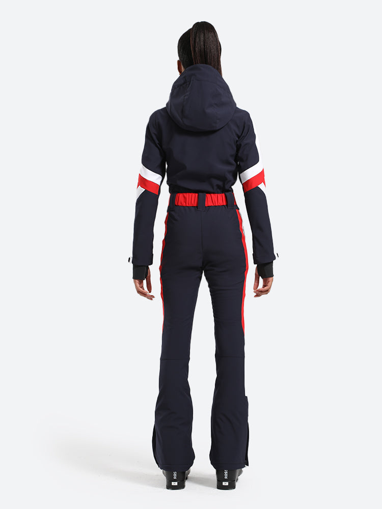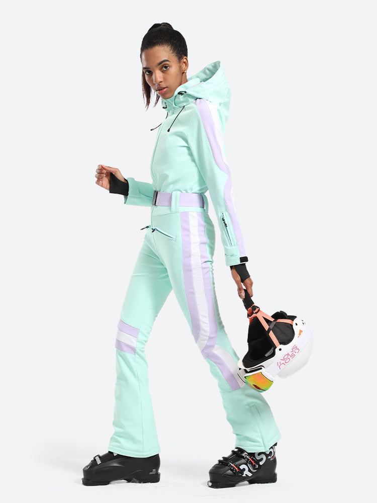 The GSou Snow one-piece ski suit has a dynamic and streamlined appearance, with a clean, modern design that often features bright colors and high-contrast combinations to enhance visibility on the slopes, the outfit appears sleek and fashionable on the slopes.