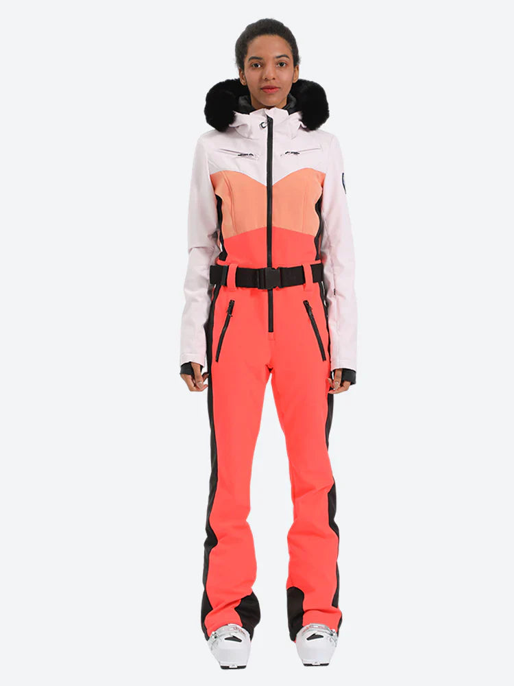 Women's Orange & Pink Waist-Defining Waterproof Insulated One-Piece Ski Suits
